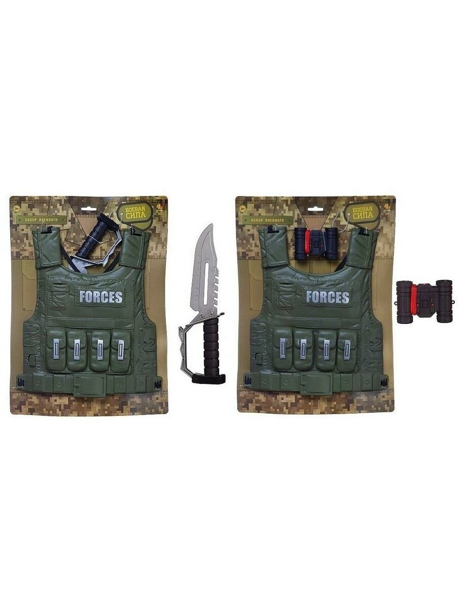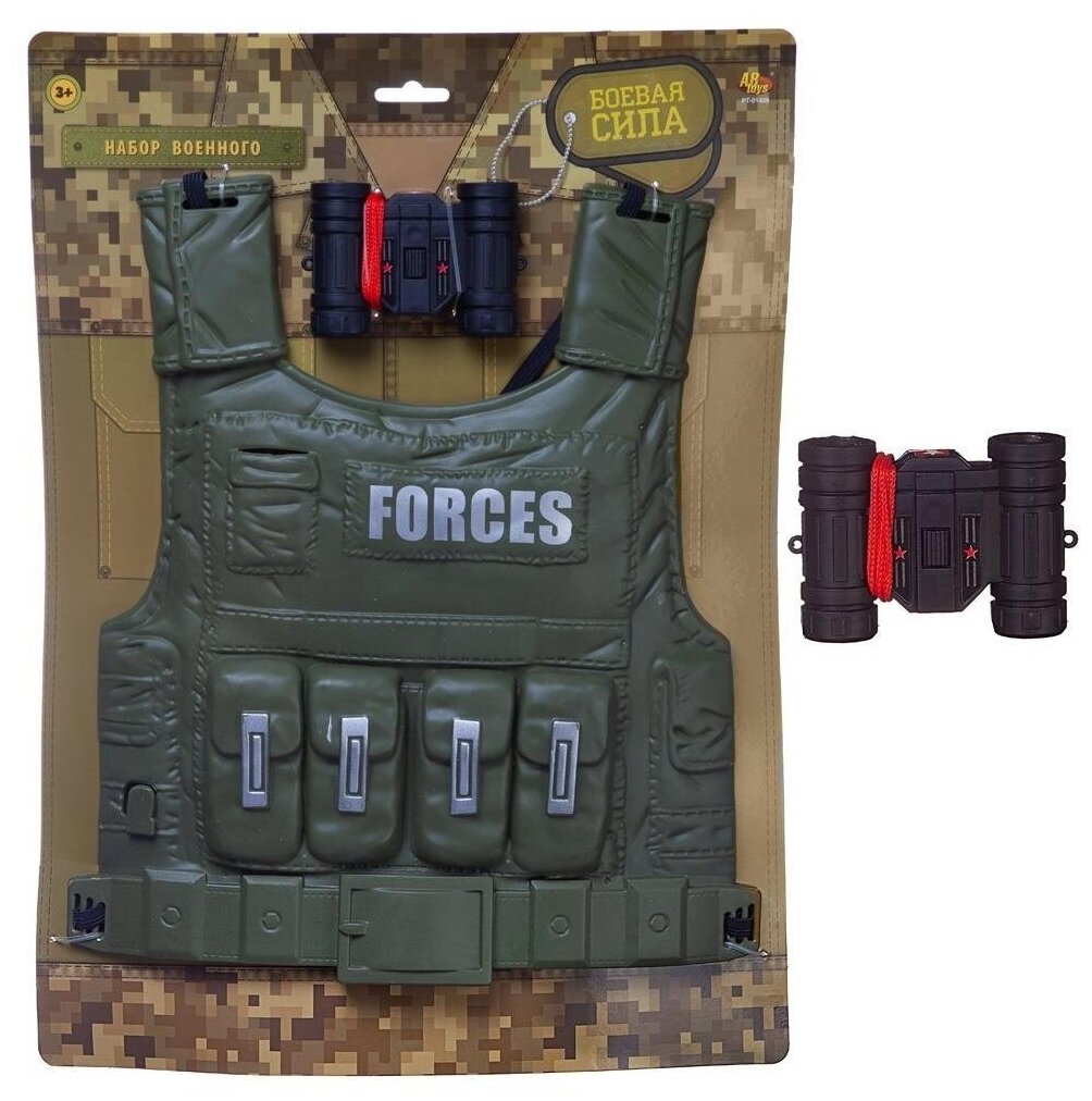 В состав набора входят: военный жилет, бинокль.