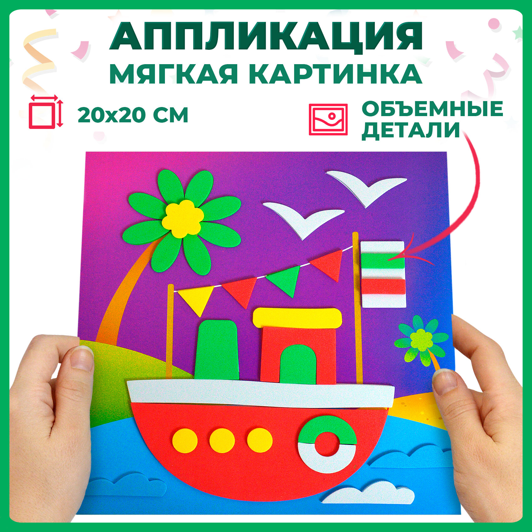 Для создания забавной мягкой картинки вам не понадобятся дополнительные материалы, клей или ножницы. Всё необходимое вы найдёте в нашем наборе. Чтобы наклеить деталь, нужно аккуратно снять её с защитной плёнки и приложить в нужное место на картинке.