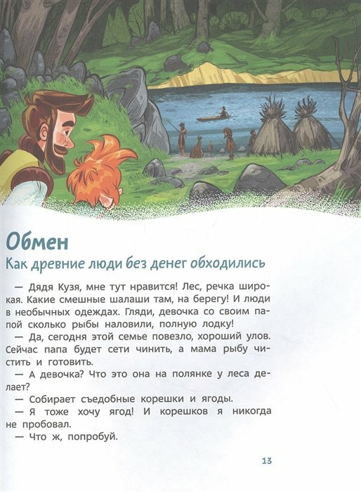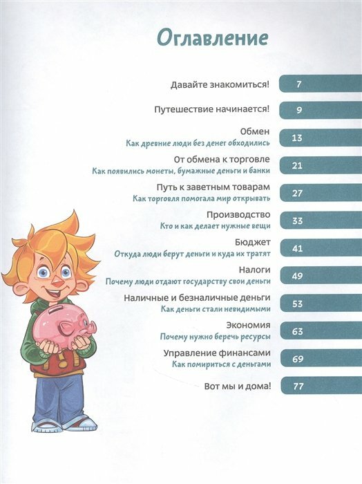 Данная книжка просто мини пособие по экономической теории. Здесь очень понятно и увлекательно рассказано и о том, как люди обходились без денег, как научились торговать, как появились деньги, и какими они были, как торговля «научила» людей путешествовать, и открывать новые земли, и о производстве, и о бюджете и налогах, об экономии и управлении финансами.