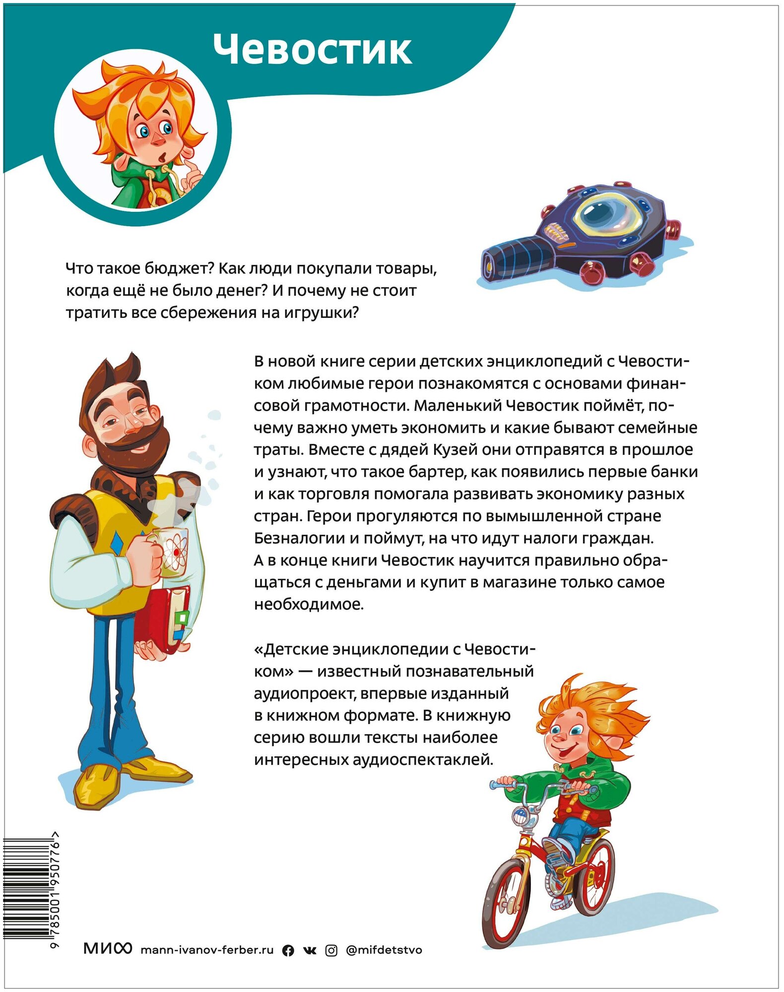 В новой книге серии детских энциклопедий с Чевостиком любимые герои познакомятся с основами финансовой грамотности. Чевостик узнает, что такое деньги и откуда они взялись, как их зарабатывать и как бюджет может помочь их потратить, для чего нужны банки и могут ли магазины и деньги быть невидимыми.