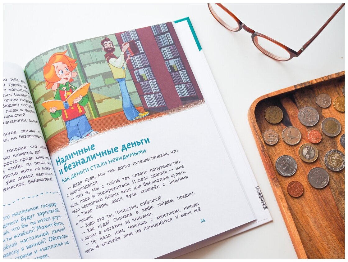 Далее уже наше время, и большая многодетная семья разбирается с бюджетом. Глава про то, куда идут налоги, а потом про наличные и безналичные деньги. Дядя и Чевостик покупают онлайн книги и заказывают еду. И прекрасная глава про то, что ресурсы надо беречь: воду закрывать, свет выключать и в целом – экономить. В заключение про рациональное и нерациональное использование финансов.