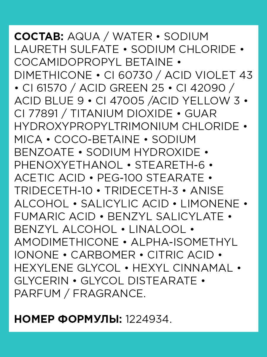 Состав: aqua / water, sodium laureth sulfate, sodium chloride, cocamidopropyl betaine, dimethicone, ci 60730 / acid violet 43, ci 61570 / acid green 25, ci 42090 / acid blue 9, ci 47005 / acid yellow 3, ci 77891 / titanium dioxide, guar hydroxypropyltrimonium chloride, mica, coco-betaine, sodium benzoate, sodium hydroxide, phenoxyethanol, steareth-6, acetic acid, peg-100 stearate, trideceth-10, trideceth-3, anise alcohol, salicylic acid, limonene, fumaric acid, benzyl salicylate, benzyl alcohol, linalool, amodimethicone, alpha-isomethyl ionone, carbomer, citric acid, hexylene glycol, hexyl cinnamal, glycerin, glycol distearate, parfum / fragrance