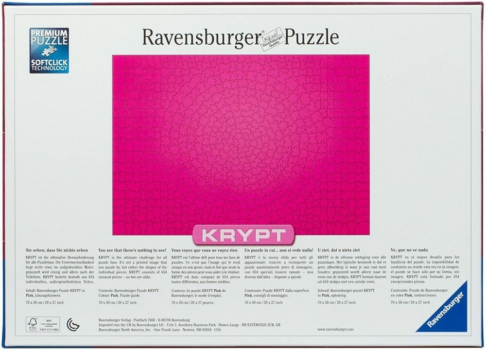 Ravensburger Пазл Крипт Розовый (654 элемента) Пазл Ravensburger «Крипт. Розовый» — это 654 элемента и очень много увлекательно проведённого времени с семьёй, друзьями или с собой любимым! Пазлы для взрослых от Ravensburger — это обширная коллекция красочных тематических сюжетов, среди которых виды природы, ландшафты, достопримечательности, исторические карты, популярные туристические маршруты. Для пазлов используются высококачественные фотографии. Собрав такой пазл, вы получите выразительную картину, которую можно использовать в оформлении интерьера. Пазлы отличаются высоким качеством полиграфии, изготовлены из экологичного сырья. Для производства пазлов используются материалы высшего качества: особенный толстый картон комбинируется с тонким верхним слоем бумаги с льняной структурой, что позволяет добиться ярких имиджей пазлов с отсутствием бликов на поверхности. Благодаря изготавливаемым вручную режущим инструментам обеспечивается идеальное сцепление элементов и уникальность вырубки каждого элемента. Пазл пригоден для многократного использования, так как при правильной эксплуатации плотный высококачественный картон не расслаивается. Сборка пазлов — отличный способ медитации и отдыха для детей и для взрослых.