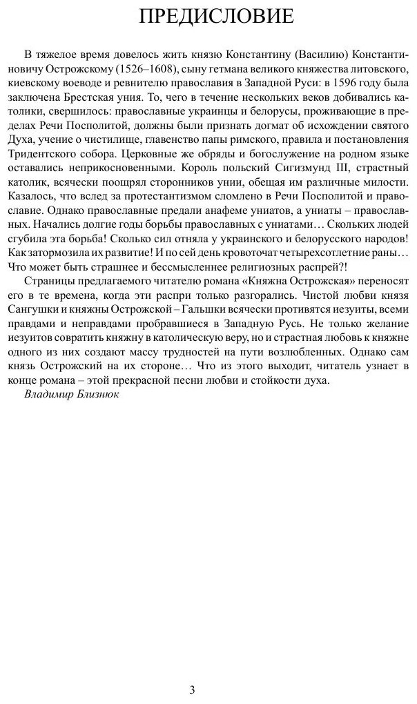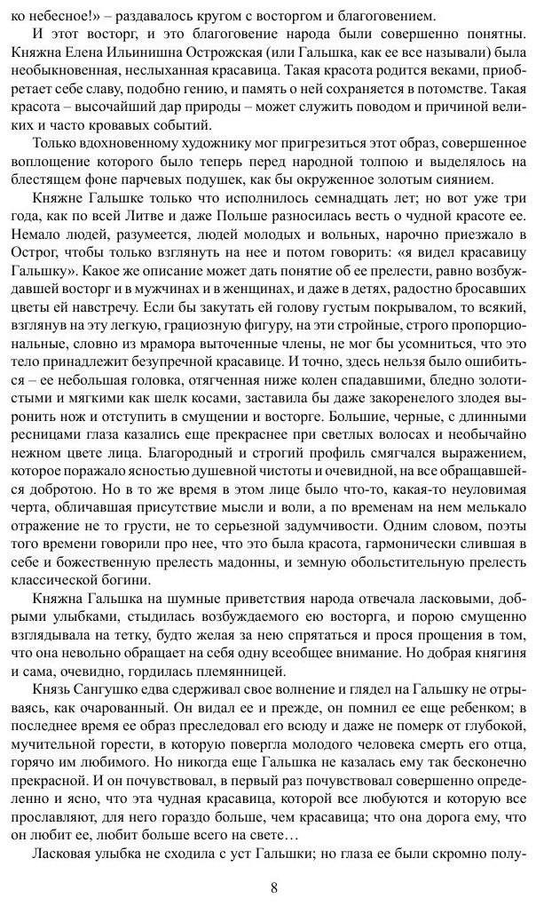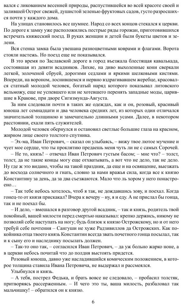 Вторая половина XVI века. Силен еще князь К. К. Острожский, ревнитель православия в Западной Руси. Но и иезуиты, всеми правдами и неправдами пробравшиеся во владения князя, набирают силу. Все яростней разгорается борьба православия с иезуитами. Не обходит стороной эта борьба и чистую любовь князя Сангушки и княжны Острожской - Гальшки. Однако сам князь Острожский вступается за молодых. Что из этого выходит, читатель узнает в конце романа - этой прекрасной песни любви и стойкости духа.