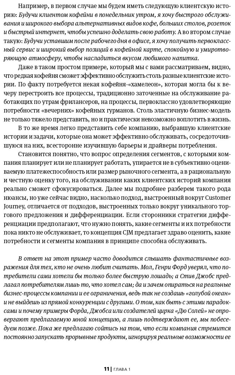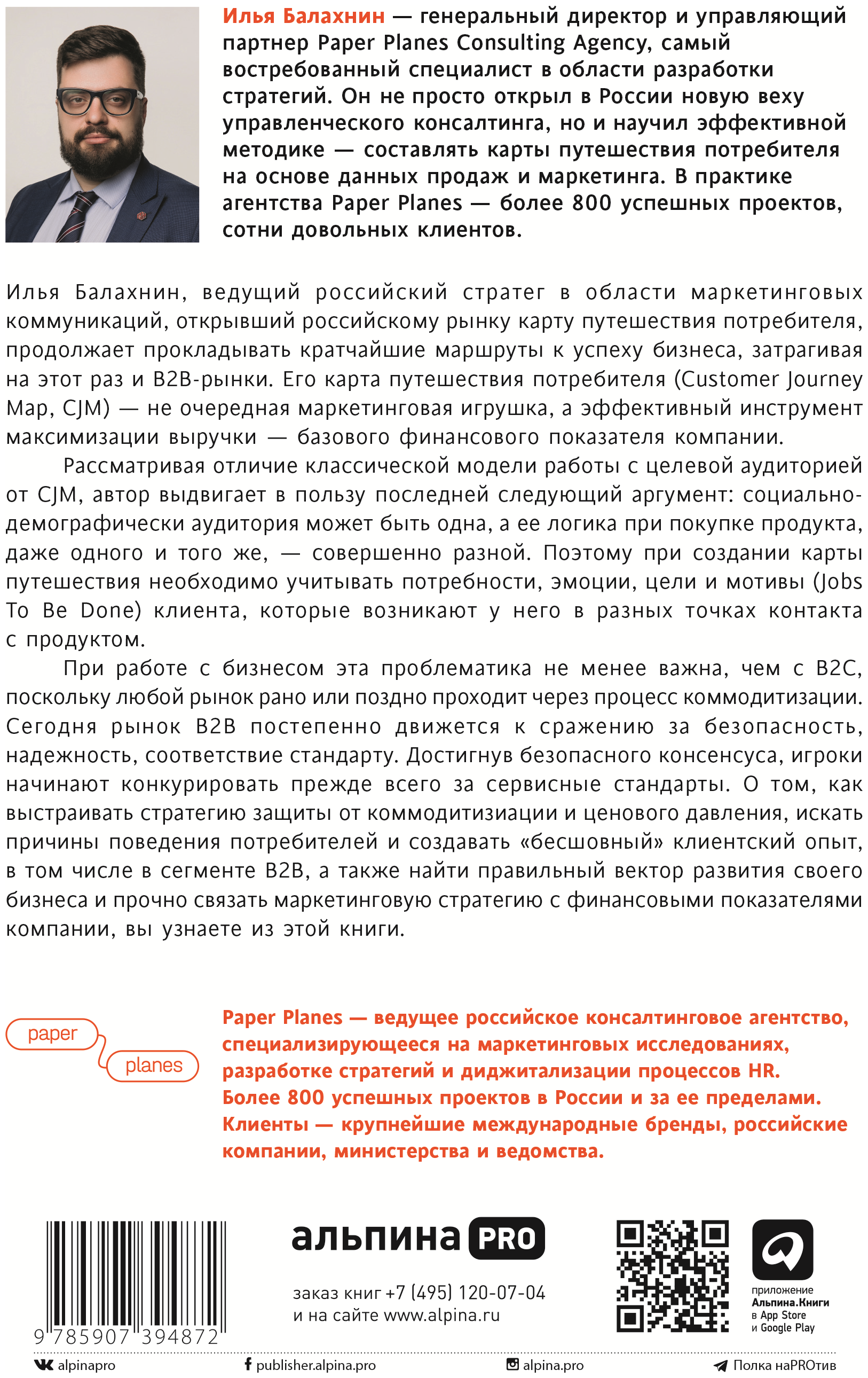 Карта путешествия потребителя (Customer Journey Map, CJM) — мощный инструмент, отражающий опыт взаимодействия потребителя с компанией. И это не очередная маркетинговая игрушка или забавная концептуальная схема. Главная задача построения карты путешествия потребителя заключается в максимизации выручки — базового финансового показателя компании.Илья Балахнин, открывший эту эффективную методику российскому рынку, продолжает исследовать путь клиента в своей новой книге, затрагивая на этот раз и B2B-сегмент. Рассматривая отличие классической модели работы с ЦА от CJM, автор выдвигает в пользу последней следующий аргумент: социально-демографически аудитория может быть одна, а ее логика при покупке продукта, даже одного и того же, — совершенно разной.При создании карты путешествия необходимо учитывать потребности, эмоции, цели и мотивы (Jobs To Be Done) клиента, которые возникают у него в разных точках соприкосновения с продуктом. При этом вместо привычного сегментирования автор предлагает строить маркетинг на основе данных. Он подробно рассказывает о лежащем в его основе многомерном моделировании, учитывающем различные количественные параметры, описывающие поведение клиента. К числу таких параметров относятся показатели формулы прибыли, взвешенные оценки важности факторов выбора и другие числовые показатели.Построенная по моделям, описанным в книге, карта путешествия потребителя показывает, в каких моментах клиенты отказываются от покупки или уходят к конкурентам, и подсказывает направление изменений. Вы сможете найти правильный вектор развития вашего бизнеса и прочно связать маркетинговую стратегию с финансовыми показателями компании.