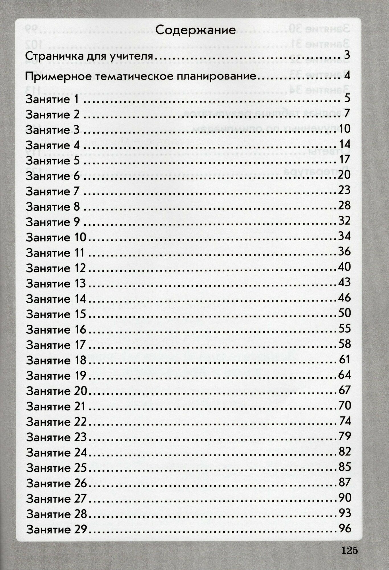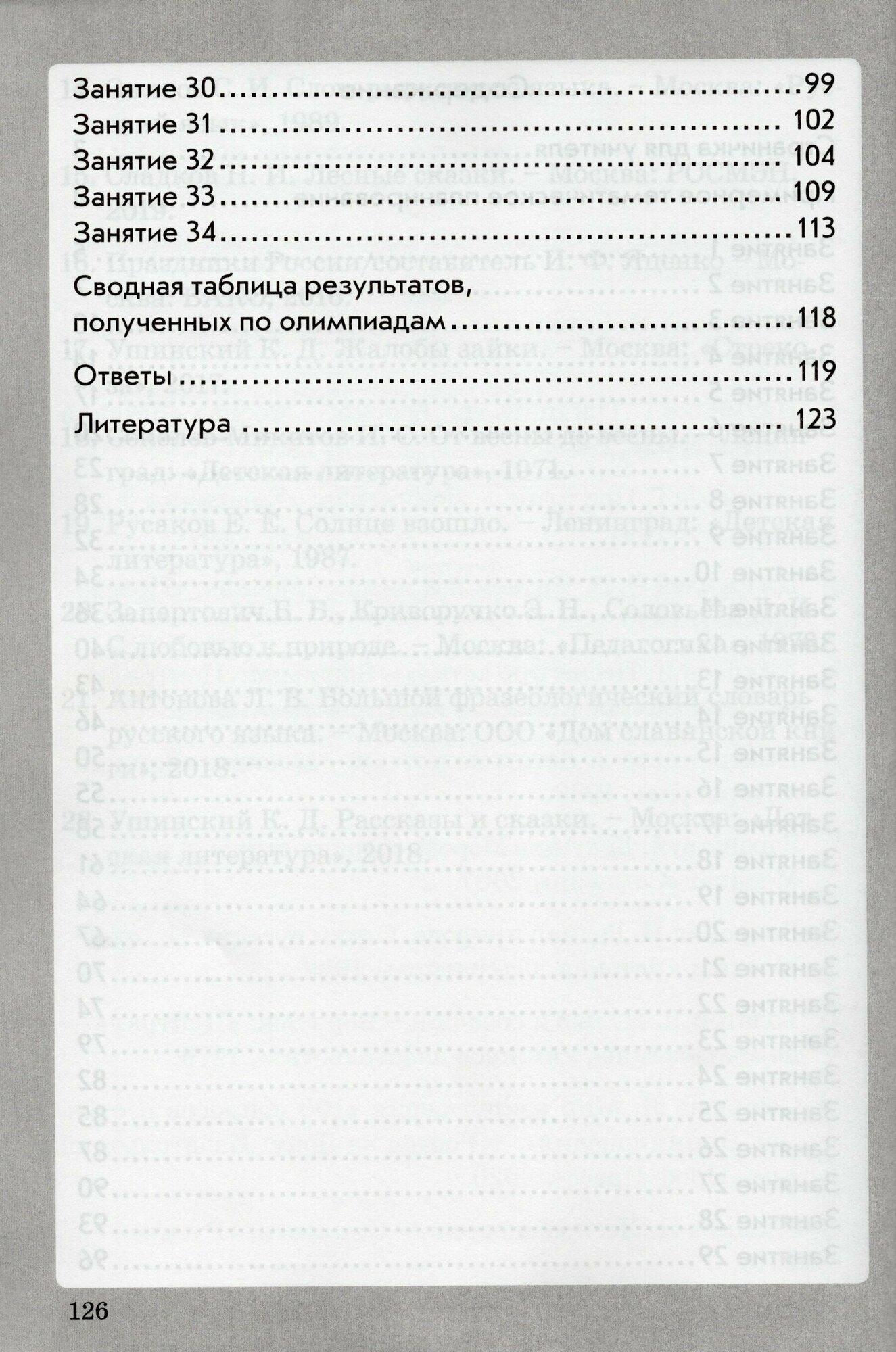 "Реши олимпиаду". К каждой олимпиаде для учителя даётся оценка результатов в баллах. В конце пособия есть "Сводная таблица полученных результатов" - итоговое количество баллов. По этой таблице можно определить победителя каждой отдельной олимпиады и победителя за учебный год. Это поможет проанализировать успехи и неудачи ученика на разных ступенях обучения в течение учебного года. В пособии даны ответы. Есть примерное тематическое планирование.