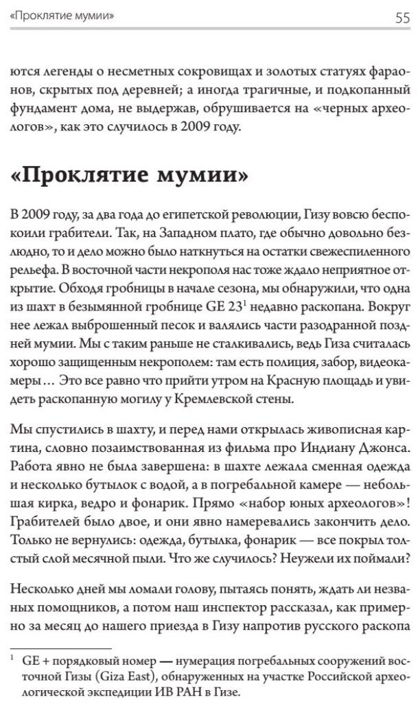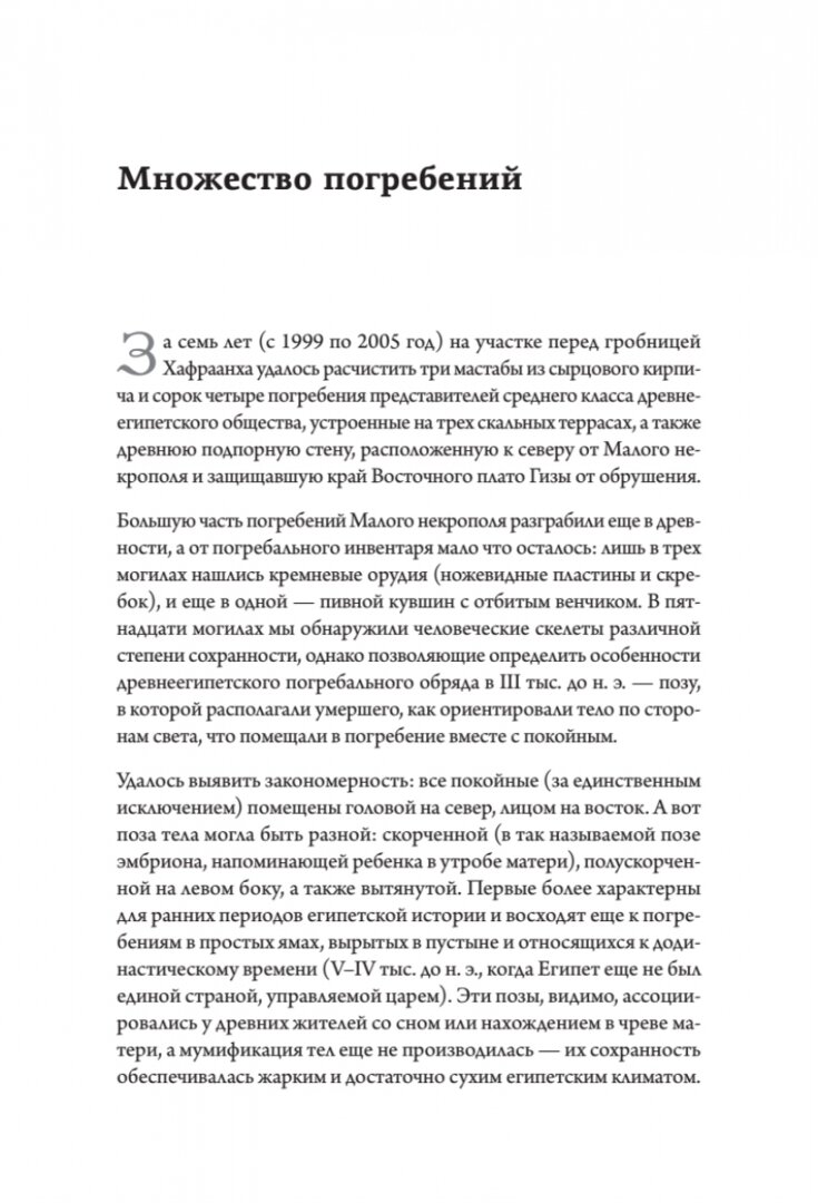 Авторы, много лет отдавшие этим раскопкам, приглашают читателя в увлекательный и полный приключений путь от Гробницы Чисел, с которой началась работа российских ученых в Гизе, через подземные камеры, заполненные распотрошенными мумиями, к потерянным захоронениям Древнего царства.