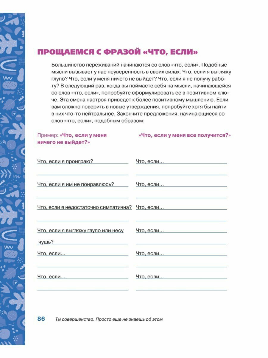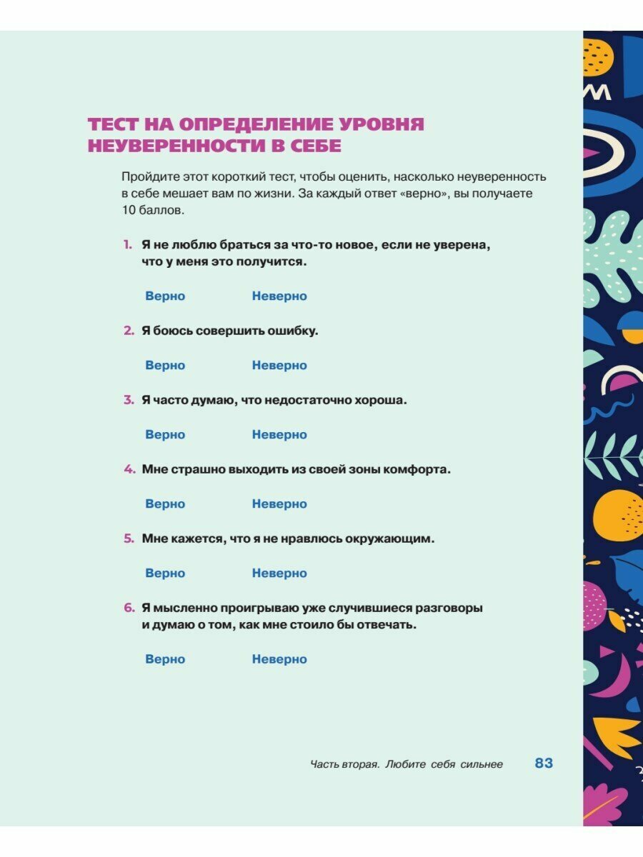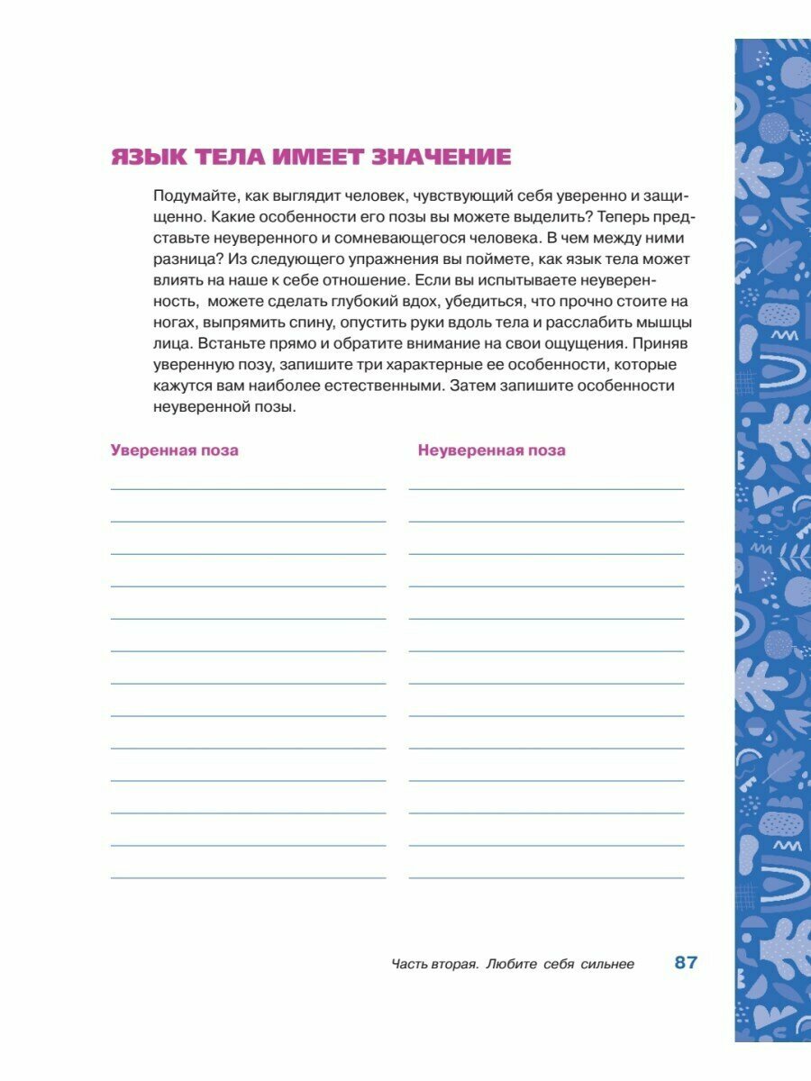 Книга, без сомнений, крутая, особенно для тех, кому сложно дается признание "Я" и повышение самооценки. К счастью, у меня нет проблем с самооценкой, но есть другие. Я слишком боялась показаться слабой и совершенно разучилась просить помощь у близких, даже тогда, когда особенно в ней нуждаюсь, а это тоже проявление любви к себе. Благодаря книге справилась с этой сложностью и без страха говорю о своих чувствах с окружающими.