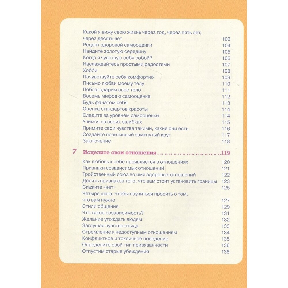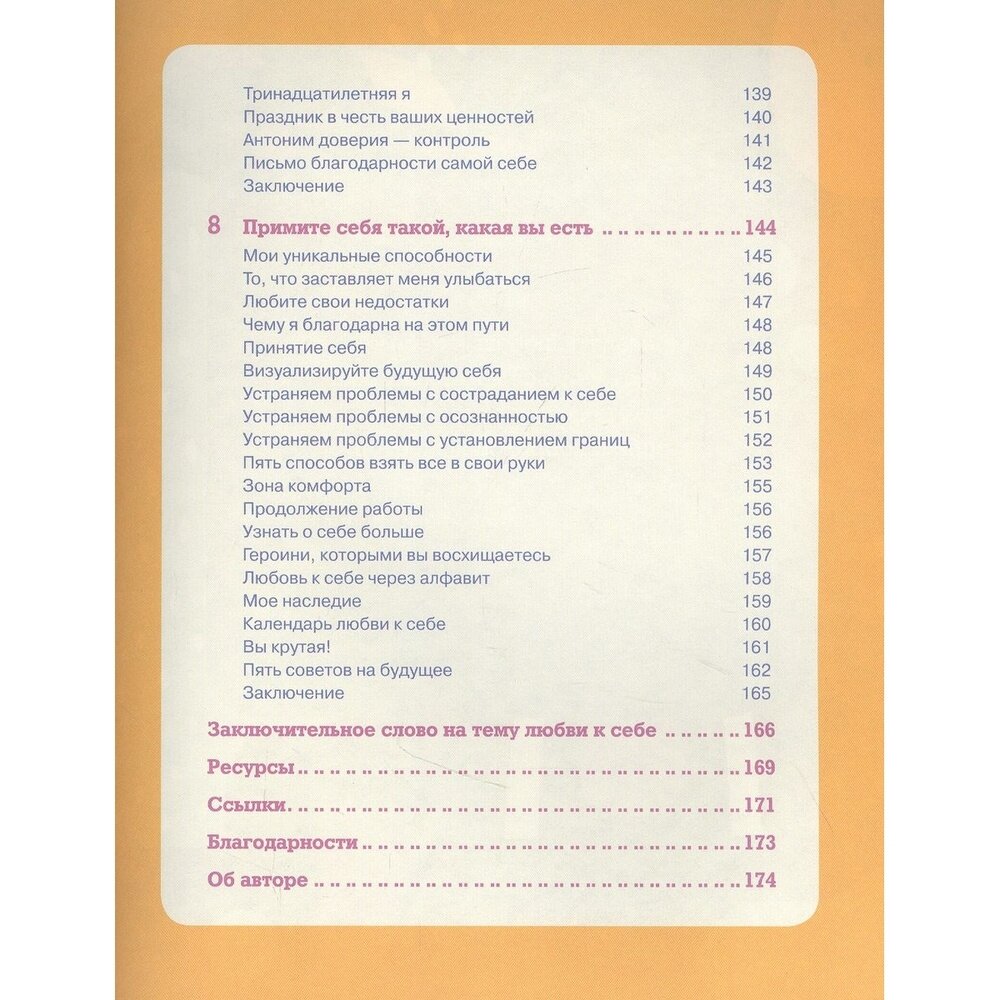 Книга может показаться несколько поверхностной. Однако, вспомните, сколько раз вы слышали от людей или читали где-то фразу "Любите себя"? И все. И никто не объяснял как, так вот автор постаралась все таки раскрыть тему. Она перечисляет несколько способом любви к себе на практике - это медитации, визуализации, йога, растяжка и спорт в целом, дыхательные практики, а так же аффирмации, ежедневное отслеживание своего состояние на бумаге и тд. Все это достаточно популярно сейчас, так что, думаю, вы уже это даже слышали. Книга изначально нацелена исключительно на женщин. Не могу сказать, что мужчинам не нужна эта информация, конечно же, любовь к себе им так же необходима, но женщины по своей природе привыкли угождать другим в ущерб себе, что является принижением себя, отсутствием личных границ и тд, что ведет к выгоранию, обидам и нелюбви к себе. Женщины в большем количестве склонны загонять себя в "стандарты" красоты, тем самым критикуя себя настоящих, склонны подстраиваться под мужчин, иногда не порядочных, патриархальное общество навязало стандарт быть "за мужем", а не ровней ему. Тесты на любовь к себе в книге так же могут быть поверхностны, однако раздел об отношениях проработан очень хорошо - полностью разобраны виды отношений и типы привязанностей, даже вплоть до примеров отказа, а это является большой проблемой. Книга сделана по типу дневника, автор просит записывать все практики и наблюдения за состоянием, чтобы работа действительно отложилась в голове, это большой плюс. Для себя я выделила несколько воодушевляющих и сильных фраз из книги, записала себе, сработает как аффирмации.