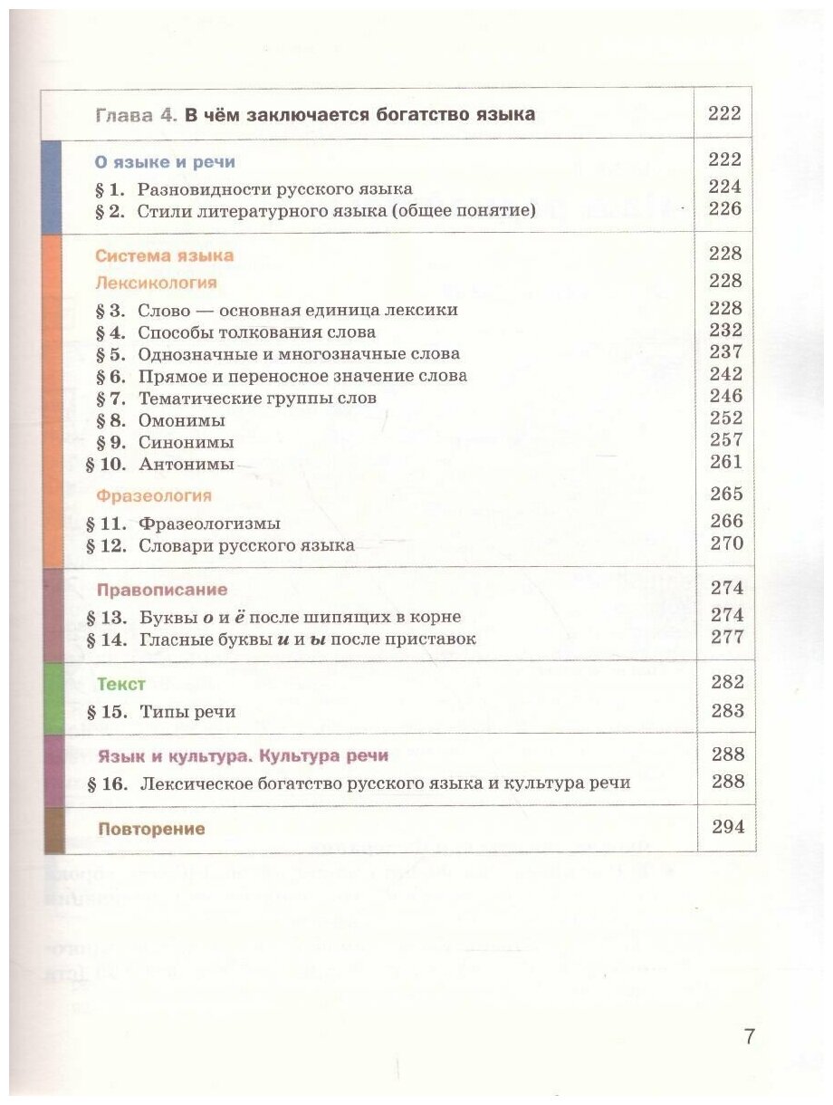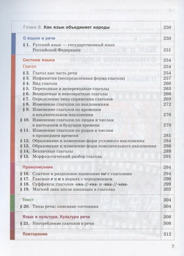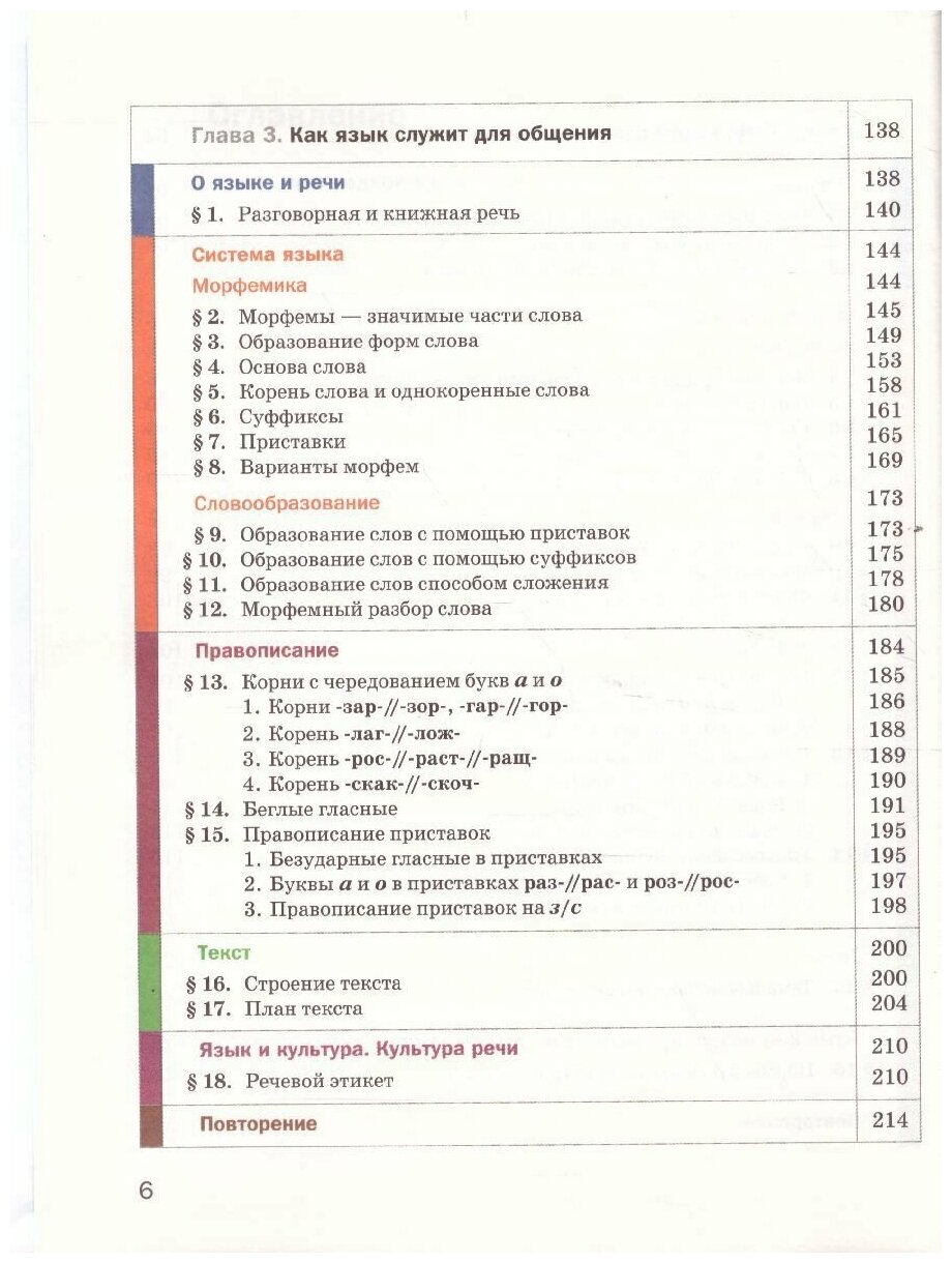 Учебник строится по модульному принципу: каждая из восьми глав включает шесть повторяющихся разделов: "О языке и речи", "Система языка", "Правописание", "Текст", "Язык и культура. Культура речи" и "Повторение".