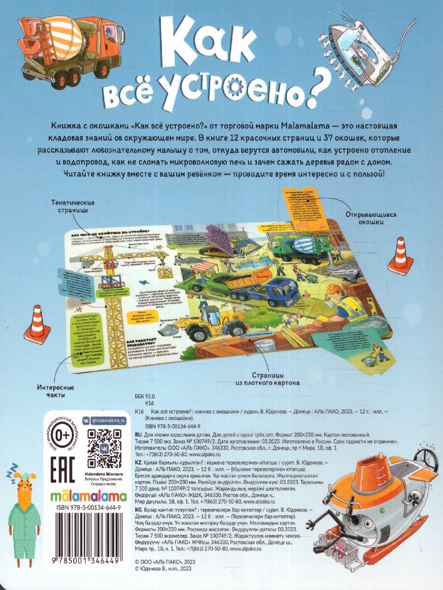 «Как всё устроено» из серии «Книжка с окошками» от торговой марки Malamalama — это книга об устройстве привычных вещей, с которыми мы сталкиваемся ежедневно. Она расскажет маленькому почемучке о том, как производят автомобили, как работает пылесос, для чего нужен маяк и откуда берётся тепло в батареях. Книга выполнена из мелованного картона и заполнена яркими, живыми иллюстрациями. Внутри окошек — интересные факты. Формат книги: 200х230 мм.