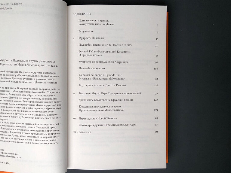Книга Ольги Седаковой «Мудрость Надежды и другие разговоры о Данте» продолжает ее же книгу «Перевести Данте» (2020), однако это уже не вопросы перевода Данте на русский, а разговор о его «врожденной и неутолимой жажде понимать», о Данте-мыслителе и поэте-теологе.
