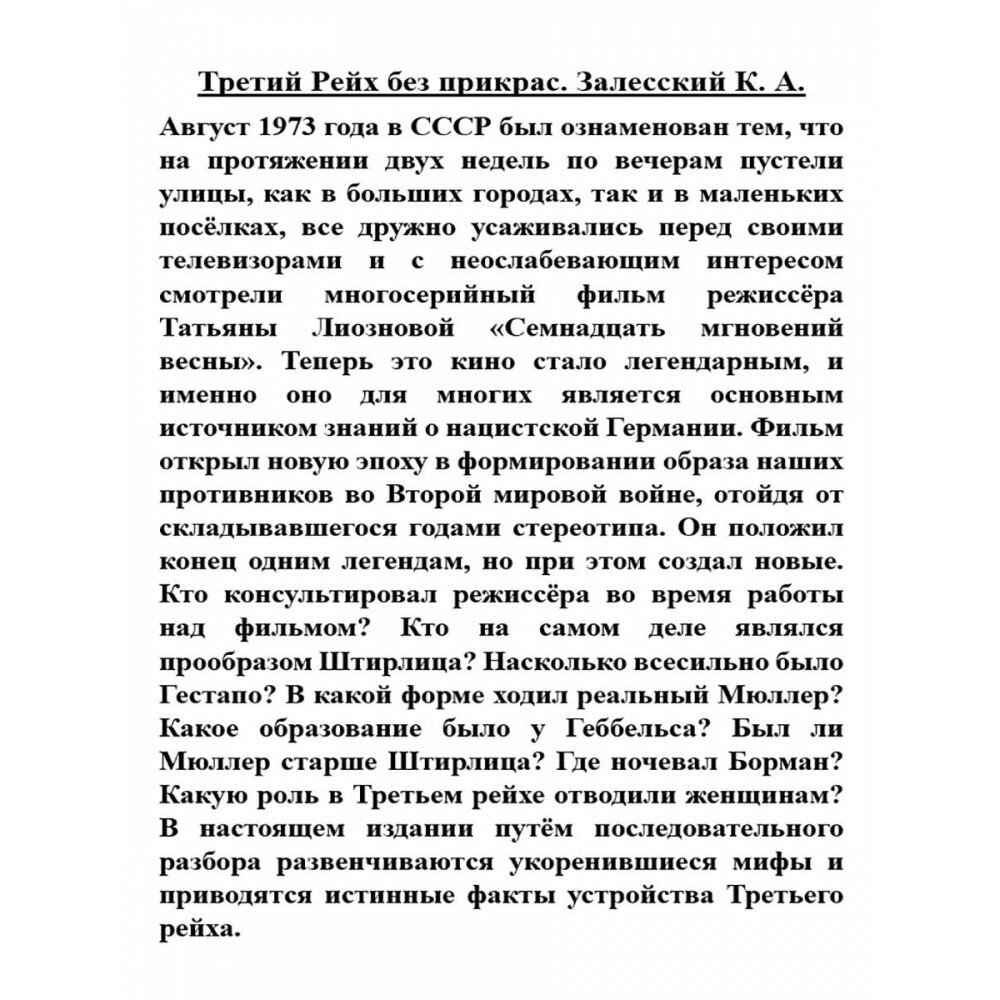 Данная книга является долгожданным переизданием книги Константина Александровича Залесского "17 мгновений весны. кривое зеркало 3 рейха". Переиздание расширенное и дополненное. Книга написана просто,понятно и увлекательно. Данная тенденция это редкое явление для подобного рода книг, так как все серьезные исследования отличаются скупостью и сухостью языка изложения.