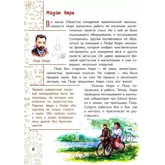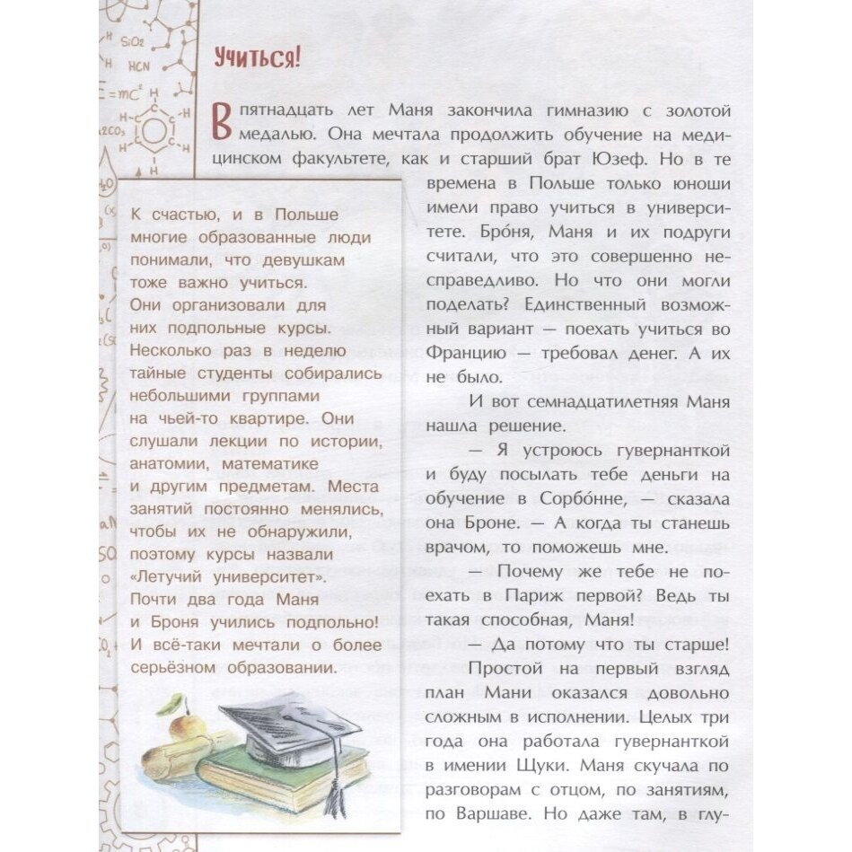 Очень люблю серию Насти и Никиты, а особенно когда эти книги о знаменитых людях. Для детей прекрасная возможность познакомить ещё с одной выдающейся личностью. И когда в школе будет изучать ребёнок физику или химию, то надеюсь проявит интерес, когда услышит знакомую с детства фамилию. В доступной форме можно рассказать детям с 5 летнего возраста, всё может быть и не поймёт, но есть повод вернуться к книги ещё раз. Об этой женщине обязательно нужно прочитать, ведь в то время даже учиться в высшем заведение женщинам нельзя было. Она не только выучилась, но и получила две нобелевских премий по физики и химии! Книга будет интересна и тем кто интересуется химией и кто с ней не дружит, т.к. в книге рассказывается, как Мари с мужем открыли полоний, радий, радон. Рассказывается о пользе радия и вреде . Не перестаю удивляться, как люди преданы своей научной работе. Чтобы мы без них делали. Рекомендую к покупке.
