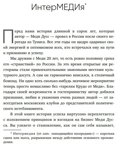 "Конкурентов хвалить не принято, но у моего коллеги и друга Меди Дусса нет конкурентов. Родился в Африке, взрослел в Советском Союзе, стал Гражданином мира и покорил всех, кто о нем слышал, - таким может быть только московский тунисец Меди Дусс. Он уникален, и об этом его книга!" - Аркадий Новиков - российский ресторатор, бизнесмен