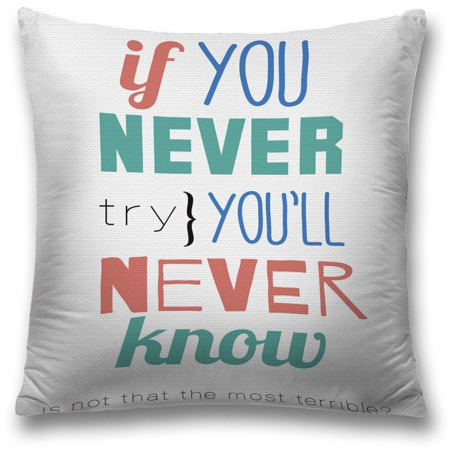 Яркие и контрастные, или наоборот, подчеркнуто строгие диванные подушки создадут нужную атмосферу и подчеркнут стиль и уют вашего гостеприимного дома. Наволочка "Если никогда не попробуешь" на молнии пошита из ткани "Оксфорд", она плотная и хорошо держит форму, рисунок получается яркий и четкий.