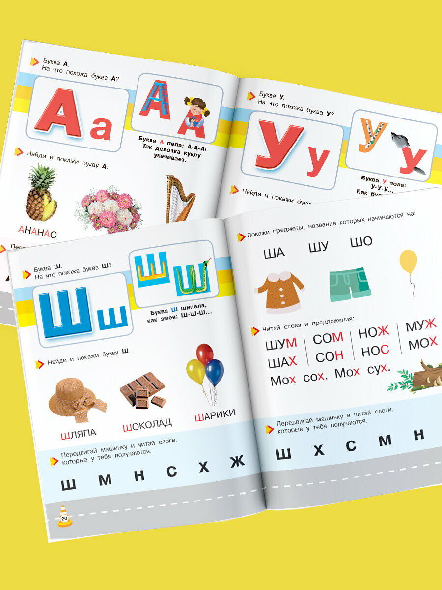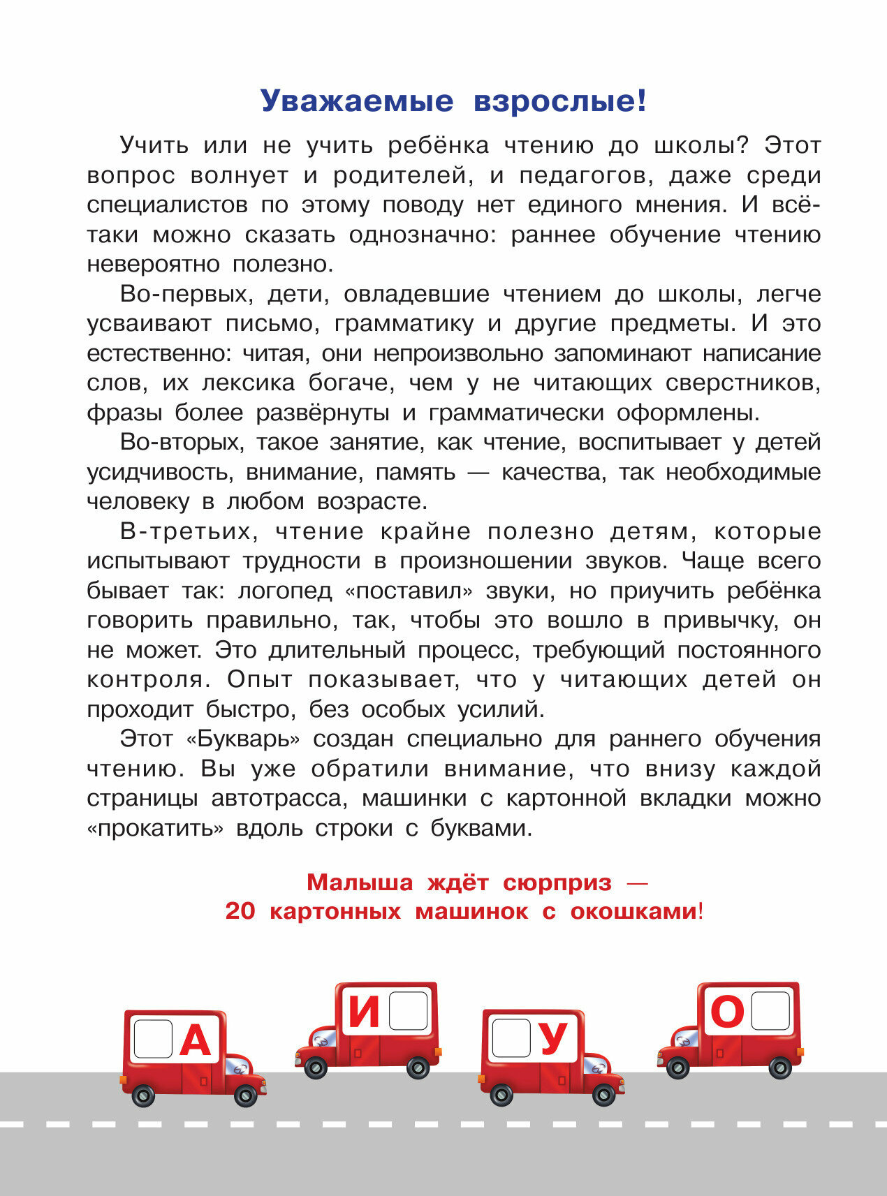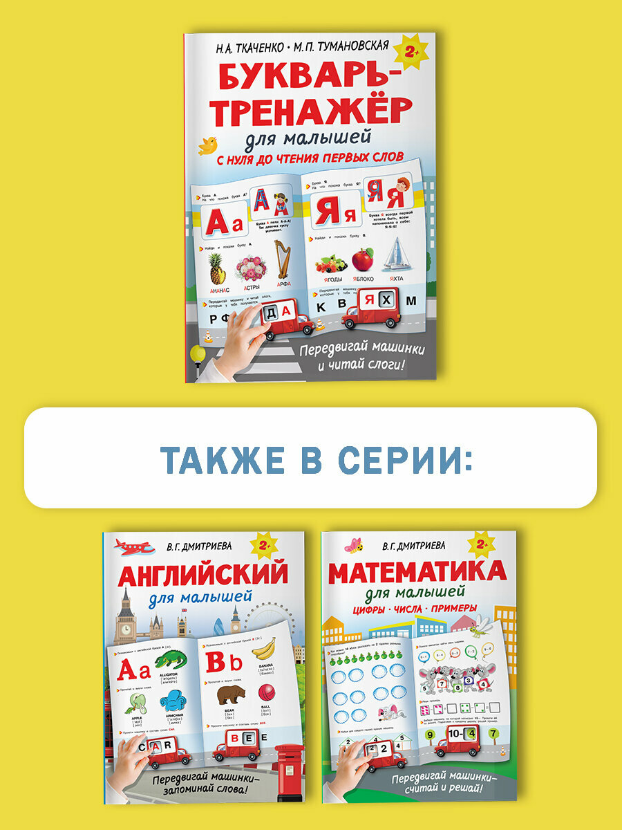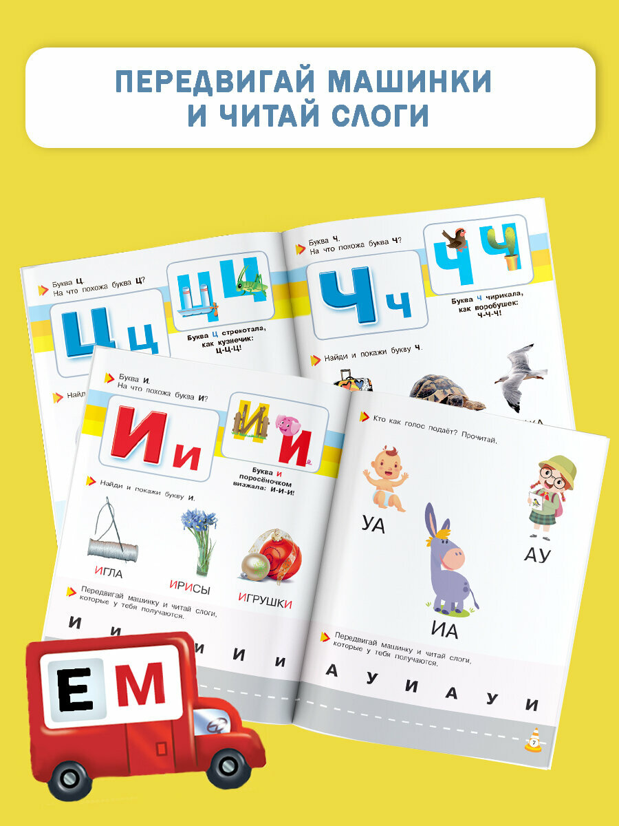 Букварь- тренажёр для малышей с нуля до чтения первых слов - большой формат книги,красочный,с картонными машинками- очень увлекает ребенка в обучении.Прекрасная подача материала с постепенным усвоением букв и чтением слогов только с уже изученными буквами.Отличный тренажёр для дошкольников,который обязательно понравится ребенку и поможет в подготовке к школе!