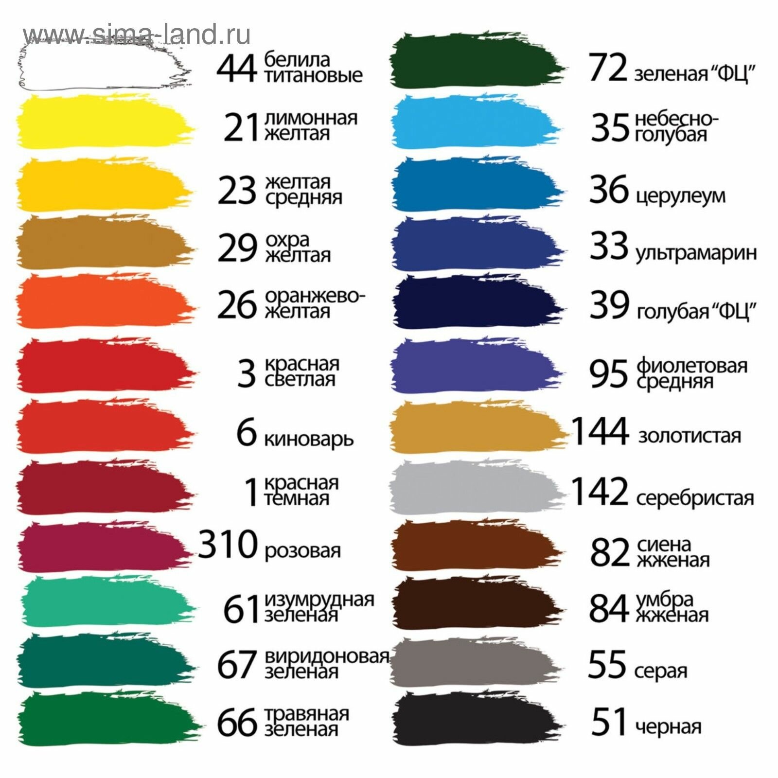 | Маркетинговый цвет | ультрамарин (033), умбра жженая (084), фиолетовый средний (095), белила титановые (044), церулеум (036), виридоновый зеленый (067), черный (051), голубой ФЦ (039), желтая средняя (023), зеленый ФЦ (072), киноварь (006), красная светлая (003), красная темная (001), лимонная желтая (021), оранжево-желтый (026), охра желтая (029), сиена жженая (082), травяной зеленый (066) |