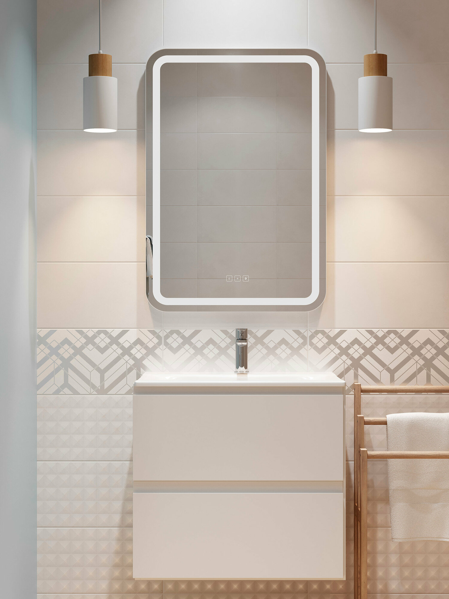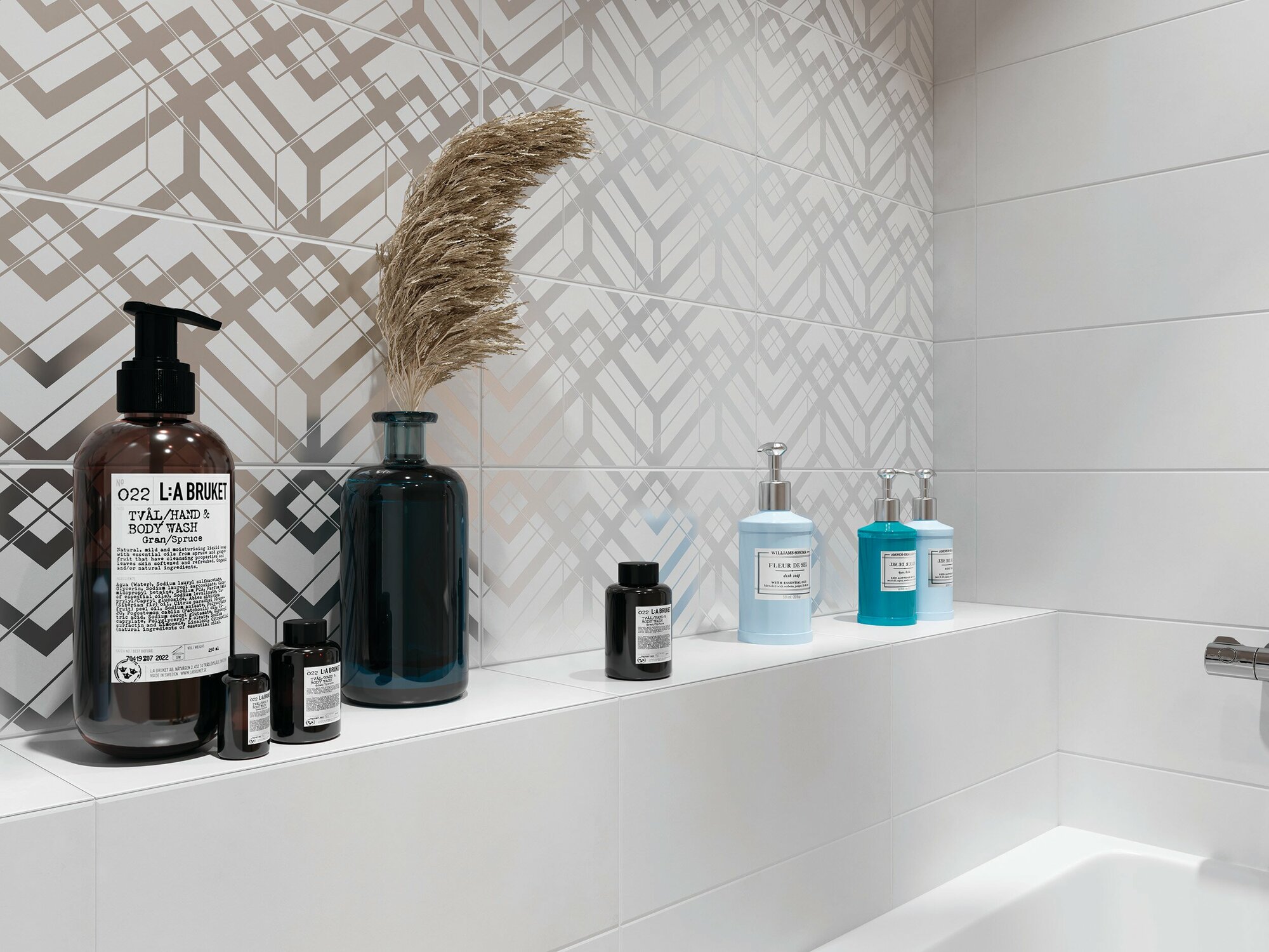 В коллекции Alrami присутствуют восточные мотивы. Рисунок керамики напоминает богатую вышивку, выполненную искусными мастерицами. Общая цветовая палитра - серо-коричневая. Фоновая плитка в светло-сером цвете выполнена в двух вариантах. Это классический ровный кафель и фактурная керамика с геометрическим рельефным рисунком. Плитка универсальная и подойдет для декорирования не только ванной комнаты