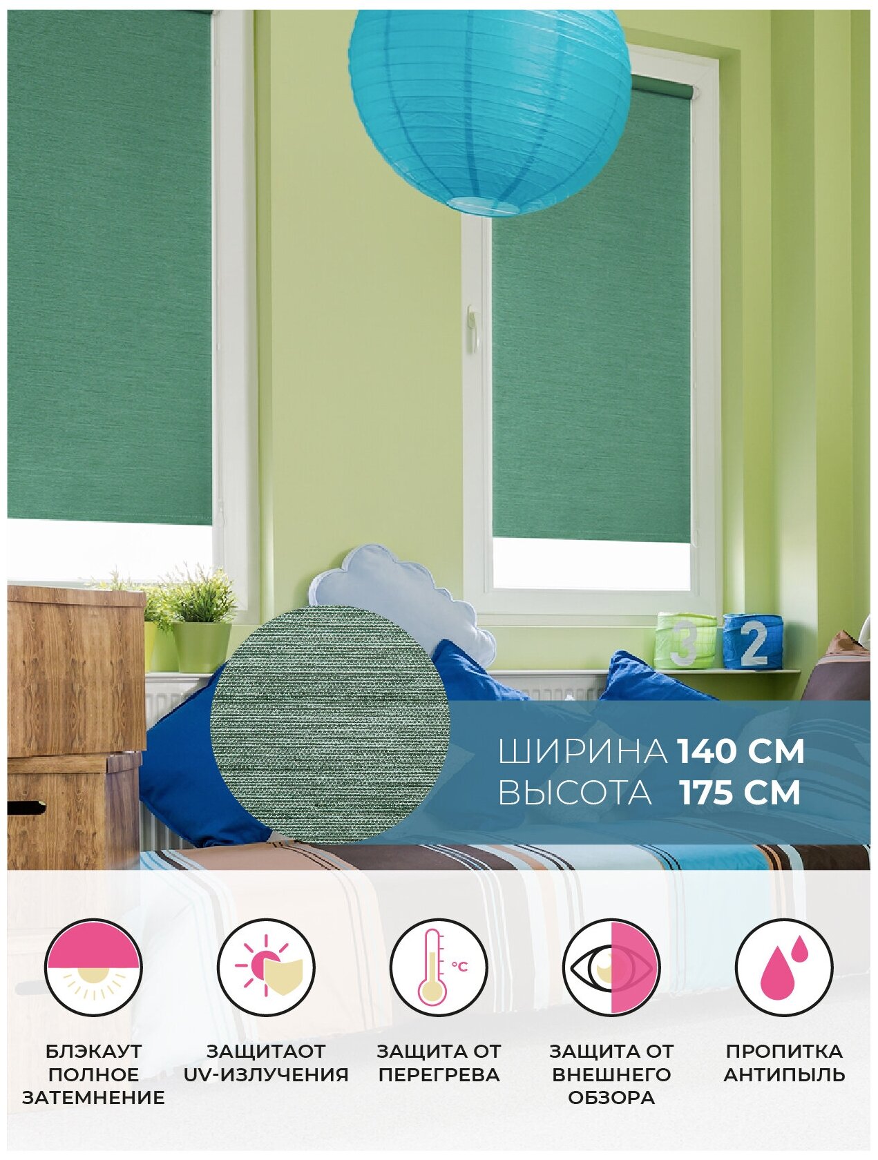 штора рулонная blackout сатин 140*175см малахитовый Arttex