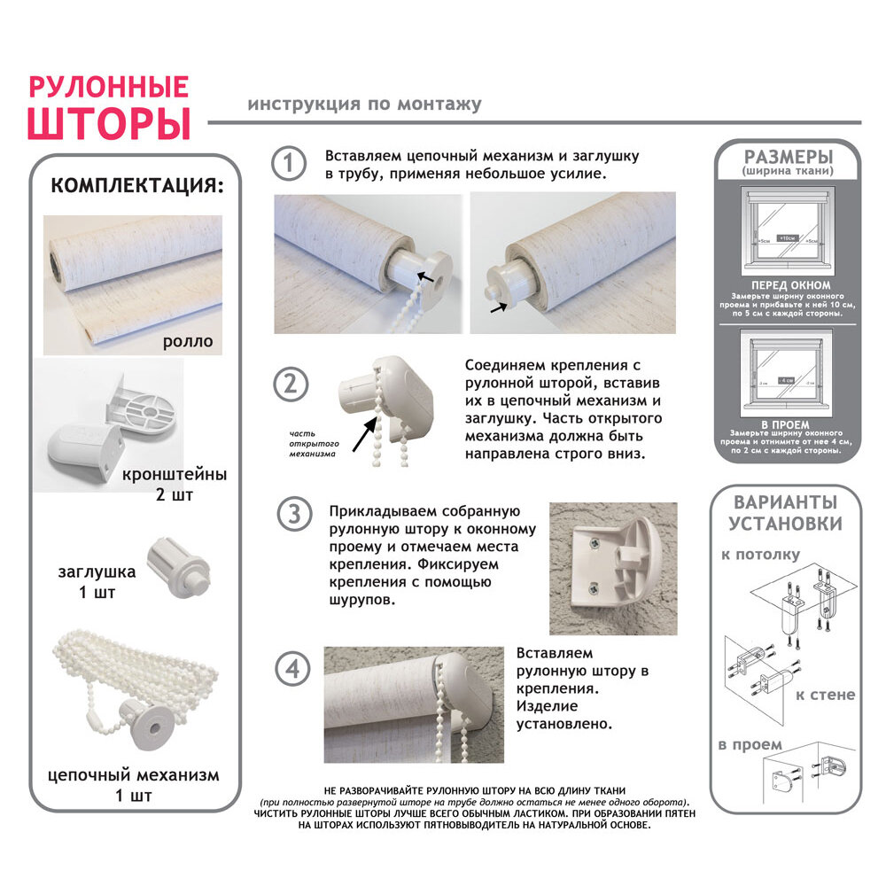 Рулонные шторы Светонепроницаемость 40%-50% Монтажный комплект прилагается. Обеспечат доступ лучам солнца или укроют от полуденного зноя. Текстиль, обрабатывают пропитками с пылеотталкивающими свойствами. Изделие устойчиво к выгоранию, замечательно сочетается с различными типами штор и выступает прекрасным дополнением к дизайну интерьера. Легкая установка на все типы окон: без сверления на створку окна и в проём окна на шурупах. Магниты на нижней планке для плотного прилегания к окну. В комплекте: рулонная штора на алюминевой штанге,крепежные элементы и инструкция по установке.