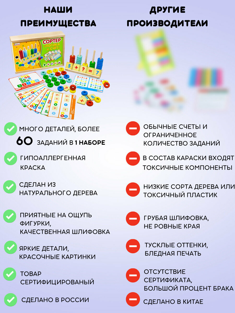 60 заданий, 80 предметов - сделают игру с сортером увлекательной и интересной. . Малышу будет удобно наглядно считать разноцветные кружки и учится складывать и вычитать. Качественная и увлекательная игрушка напрямую с фабрики.