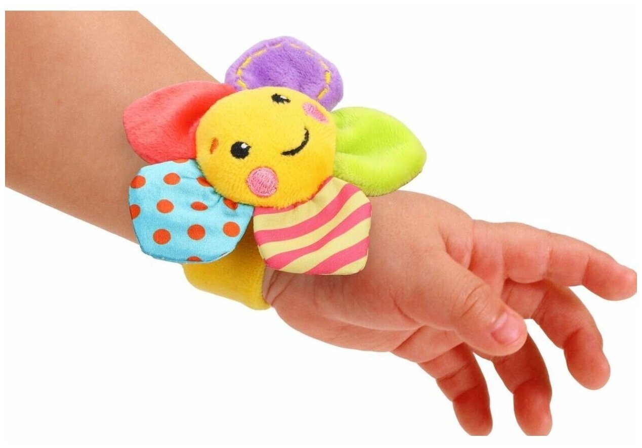 Погремушка на руку Цветочек сшита из приятных на ощупь тканей разных красочных цветов. Основанием игрушки служит мягкий текстильный браслет, который надёжно закрепляется на ручке малыша при помощи липучек. В листиках цветочка спрятана
