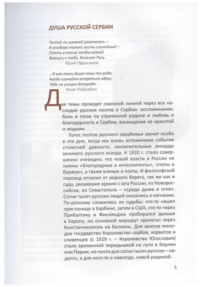 Книга, написанная историком Еленой Бондаревой - специалистом по русской эмиграции, много лет работавшей в Сербии, на основании личных встреч и бесед, работы в архивах, библиотеках и музеях, является первой попыткой познакомить русского читателя с поэтическим наследием, а также с богатейшим наследием русских художников, творивших в это время в Королевстве СХС. Опыт соединения художественных полотен и стихотворных строк создает особую цельность культурной атмосферы удивительного явления - Русской Сербии, существовавшей между двумя мировыми войнами.