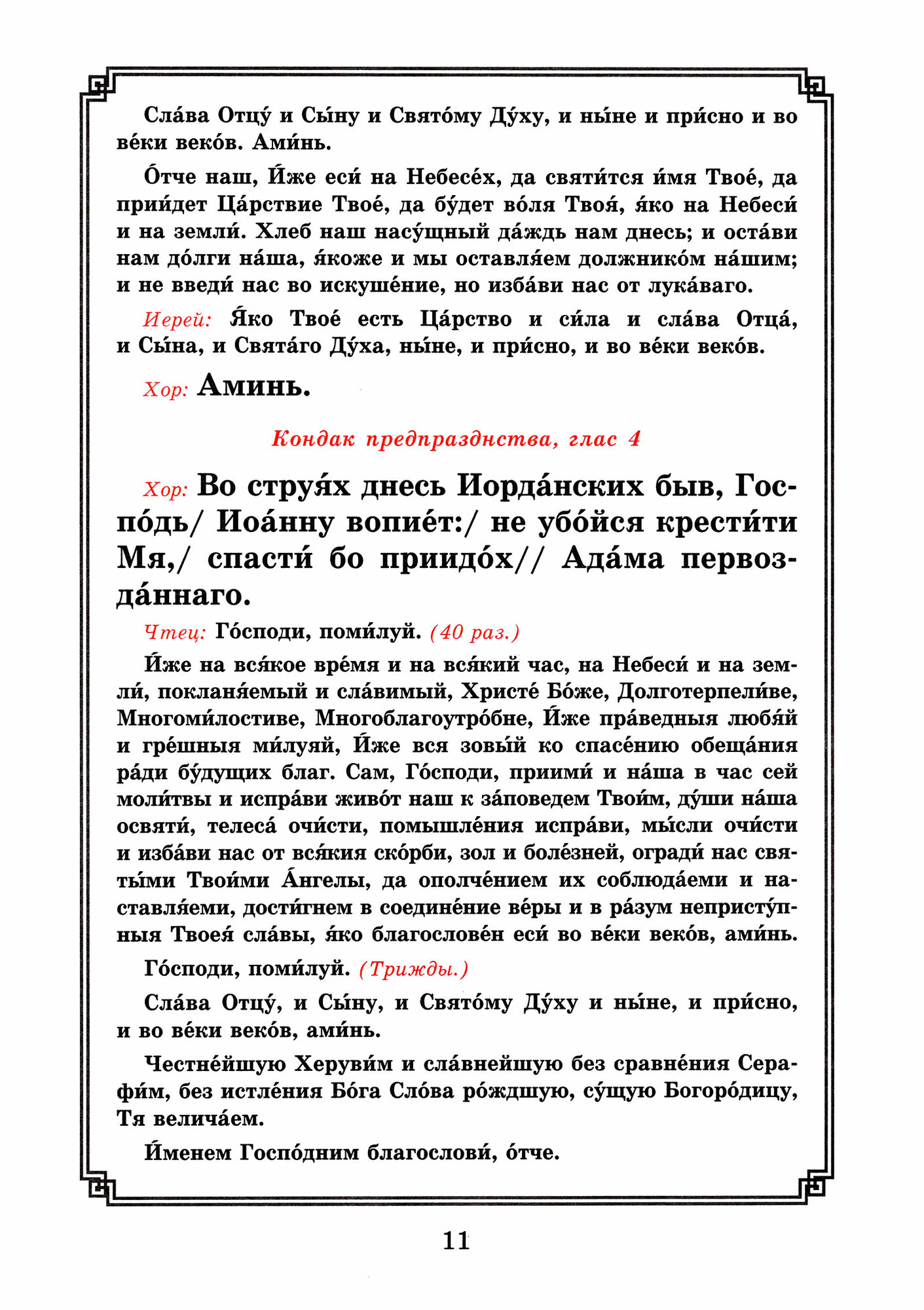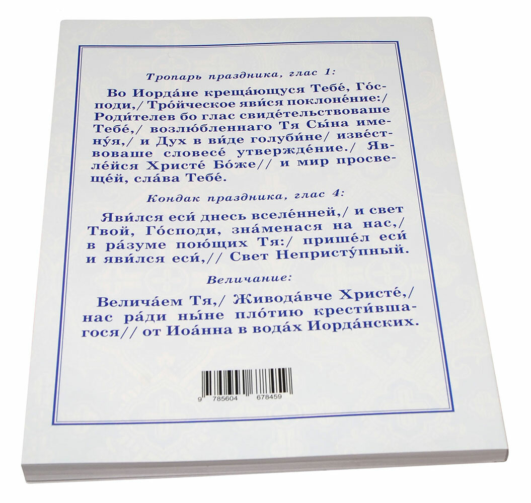 Издание содержит последование службы Крещенского сочельника, Великий чин освящения воды и тексты праздничного богослужения Богоявления.