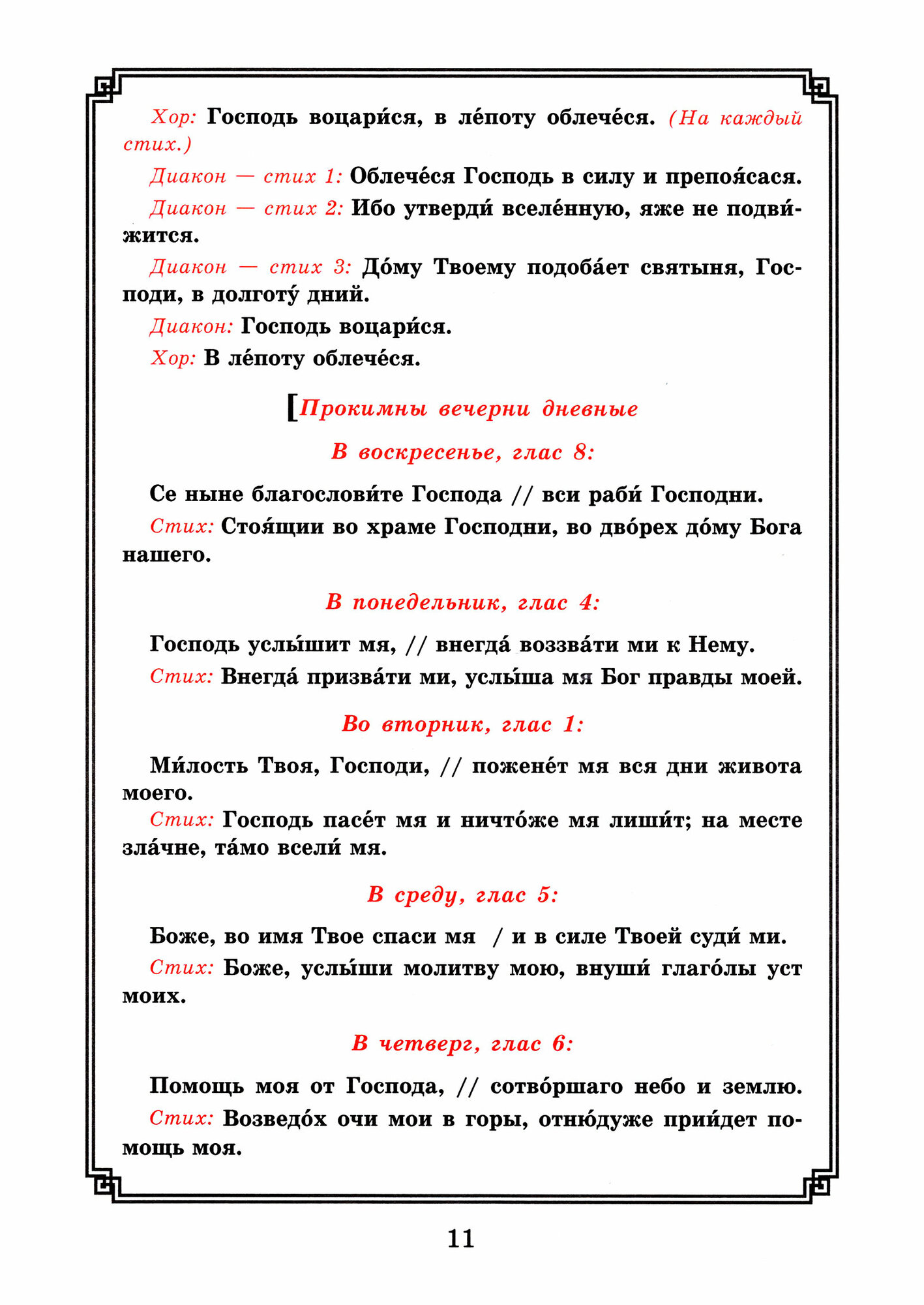 Неизменяемые нотные песнопения и текст чтеца набраны средним шрифтом, а изменяемые песнопения - укрупненным, с ударениями и разметкой для пения.