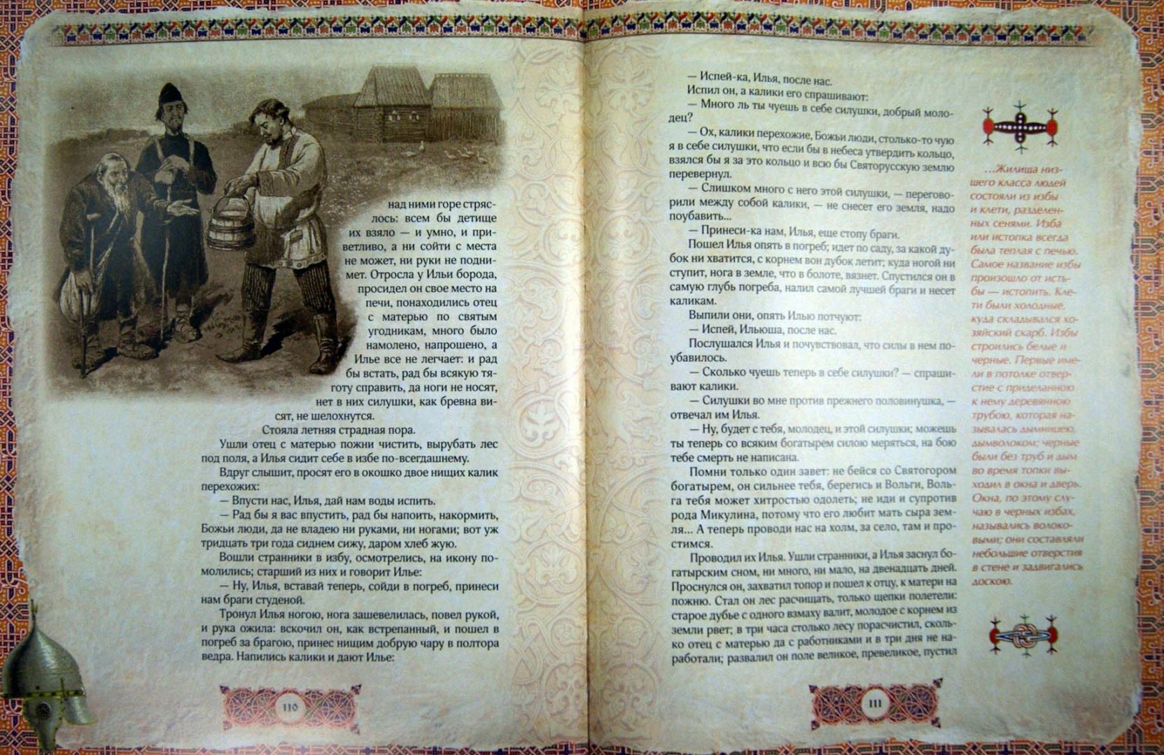 Купил в подарок, не удержался. Не знаю, дарить ли теперь. Такую книгу хочется оставить дома. Оформлена шикарно. Былины в прозе. Одновременно на полях рассказывается о том, как все было на самом деле. В реальности, с точки зрения историков, а не в былинном эпосе. Подбор иллюстраций превосходен. Это и картины художников (не только вездесущий Васнецов), лучшая русская графика на тему былин, а еще высококачественные репродукции настоящего вооружения русских средневековых воинов. Хочется эту книгу читать и разглядывать. Читать детям и взрослым. Просто супер! Отличный замысел, к которому не хочется придираться. Такой вот восторг.