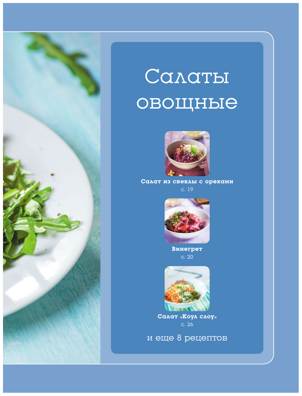 Небольшая книга сама по себе , зато с яркими и приятными страницами. Есть разные главы в зависимости от главного ингредиента в салате ( рыба , курица , говядина )