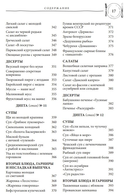 Расписаны 15 столов для различных болезней с вредными и полезными продуктами, разделены на супы, салаты, вторые блюда, десерты. Но книга не сухая, не только рекомендации и рецепты! Внутри добавлены авторские комментарии, с юмором. В самом начале стоит вводное слово диетолога С.П.Моноха, который не требует неукоснительного соблюдения диеты, а предлагает все же дотрагиваться и до неполезных продуктов, естественно в малых объемах, но обязательно, чтобы помнить их вкус, доставлять радость себе. А ведь радость при любой болезни – главный компонент выздоровления.