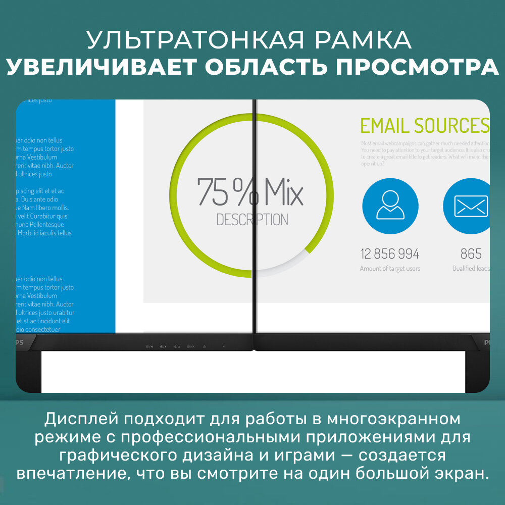 Широкоугольный монитор Philips V Line позволяет просматривать контент на новом уровне и располагает широким рядом полезных функций. Технология Adaptive-Sync обеспечивает плавное воспроизведение видео. Такие функции, как антиблик, режим LowBlue и предотвращение мерцания, снизят нагрузку на глаза.
