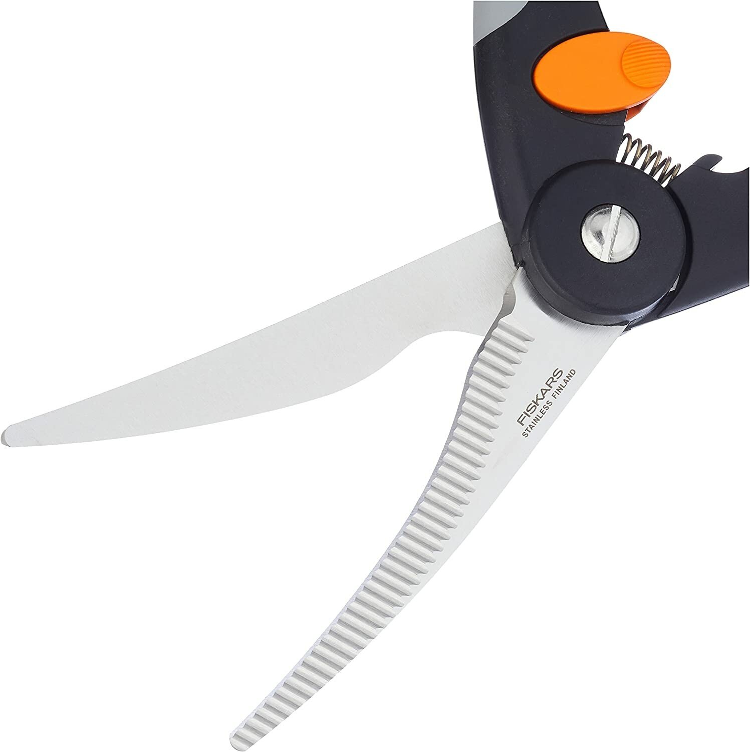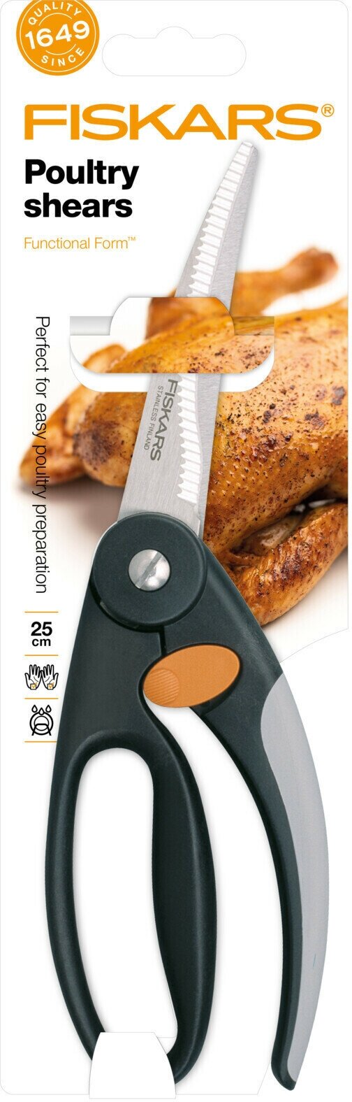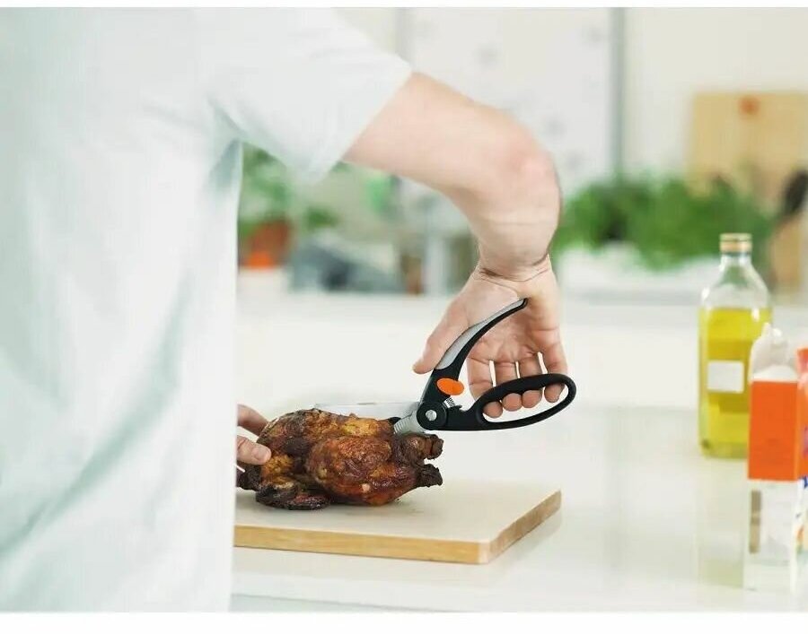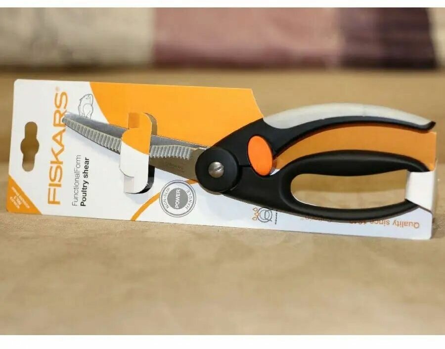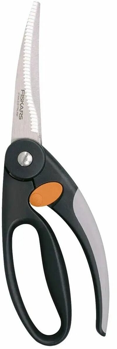 Прочные изогнутые ножницы с зазубренным лезвием позволяют легко справляться с разделкой и обработкой птицы и дичи. Зазубренное лезвие хорошо режет кости. Ручки с мягким захватом и удобной большой петлёй подходят как для правшей, так и для левшей. Механизм блокировки включается большим пальцем. Натяжение лезвий регулируется с помощью винта. Познакомьтесь с иконой дизайна В 1967 году ножницы с оранжевыми ручками компании Fiskars стали настоящей революцией. Они были не только легче, комфортнее и удобнее в обращении, чем тяжелые кованые ножницы, но и намного эффективнее резали. С тех пор в мире было продано более миллиарда ножниц Fiskars.Сегодня наши ножницы пользуются любовью во всем мире за отличное качество разрезания и легендарную надежность. У нас найдутся подходящие ножницы для любого занятия, будь то приготовление еды, шитье, работа в гараже или изготовление поделок с детьми.