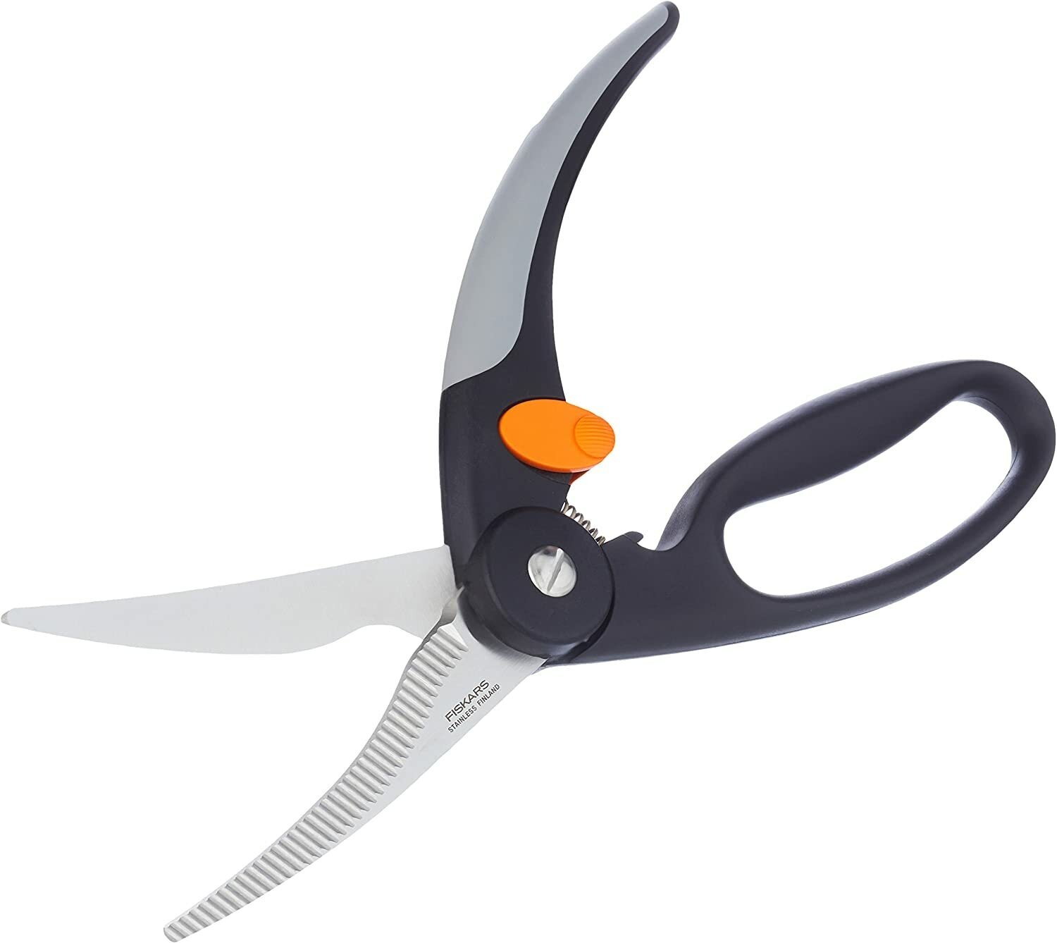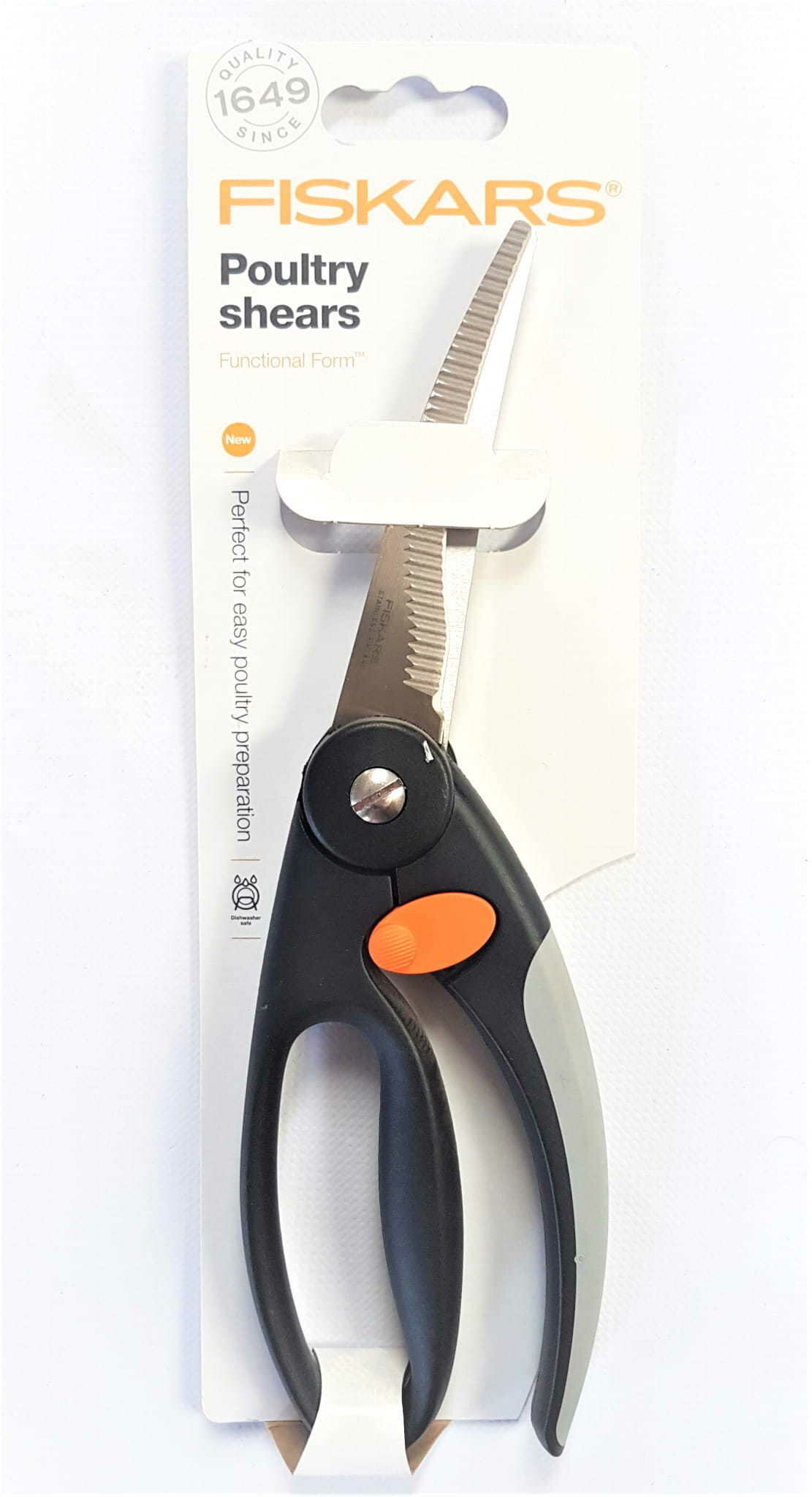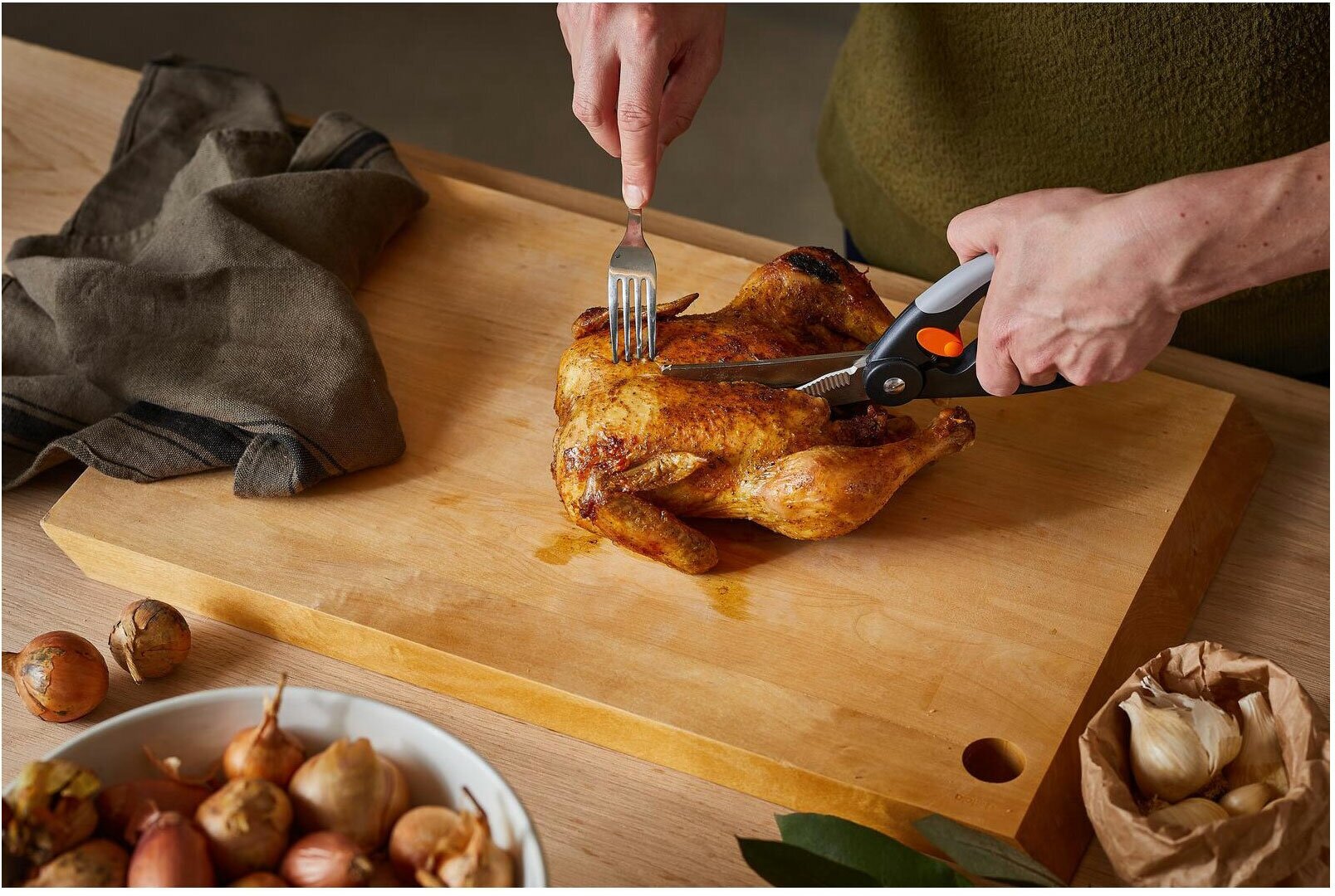 Прочные изогнутые ножницы с зазубренным лезвием позволяют легко справляться с разделкой и обработкой птицы и дичи. Зазубренное лезвие хорошо режет кости. Ручки с мягким захватом и удобной большой петлёй подходят как для правшей, так и для левшей. Механизм блокировки включается большим пальцем. Натяжение лезвий регулируется с помощью винта. Познакомьтесь с иконой дизайна В 1967 году ножницы с оранжевыми ручками компании Fiskars стали настоящей революцией. Они были не только легче, комфортнее и удобнее в обращении, чем тяжелые кованые ножницы, но и намного эффективнее резали. С тех пор в мире было продано более миллиарда ножниц Fiskars.Сегодня наши ножницы пользуются любовью во всем мире за отличное качество разрезания и легендарную надежность. У нас найдутся подходящие ножницы для любого занятия, будь то приготовление еды, шитье, работа в гараже или изготовление поделок с детьми.