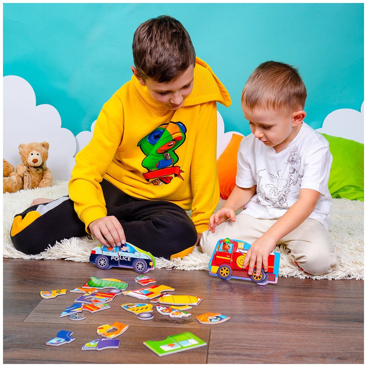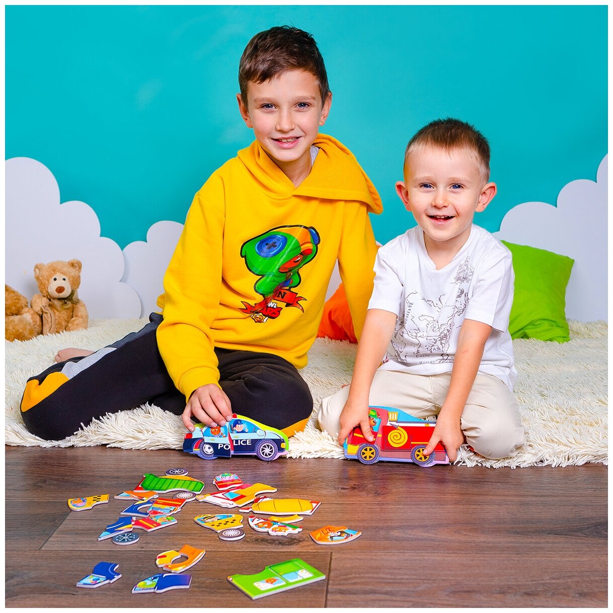 Что делать? Выбирайте автомобиль и совершенствуйте его с помощью магнитных деталей. Загляните в книжечку-инструкцию и посмотрите, какие варианты там есть. Экспериментируйте, объединяйте разные детали и создавайте невероятные машины!