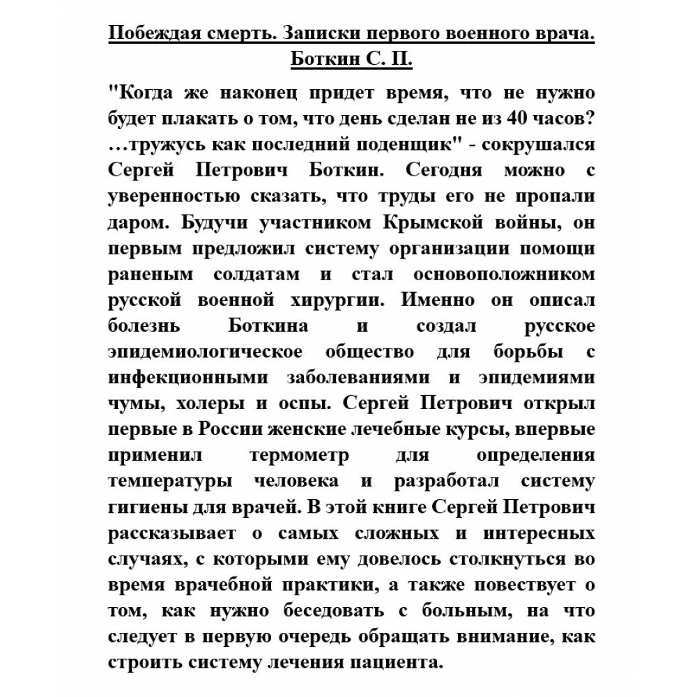 "Когда же наконец придет время, что не нужно будет плакать о том, что день сделан не из 40 часов? …тружусь как последний поденщик" - сокрушался Сергей Петрович Боткин. Сегодня можно с уверенностью сказать, что труды его не пропали даром. Будучи участником Крымской войны, он первым предложил систему организации помощи раненым солдатам и стал основоположником русской военной хирургии. Именно он описал болезнь Боткина и создал русское эпидемиологическое общество для борьбы с инфекционными заболеваниями и эпидемиями чумы, холеры и оспы. Сергей Петрович открыл первые в России женские лечебные курсы, впервые применил термометр для определения температуры человека и разработал систему гигиены для врачей. В этой книге Сергей Петрович рассказывает о самых сложных и интересных случаях, с которыми ему довелось столкнуться во время врачебной практики, а также повествует о том, как нужно беседовать с больным, на что следует в первую очередь обращать внимание, как строить систему лечения пациента.