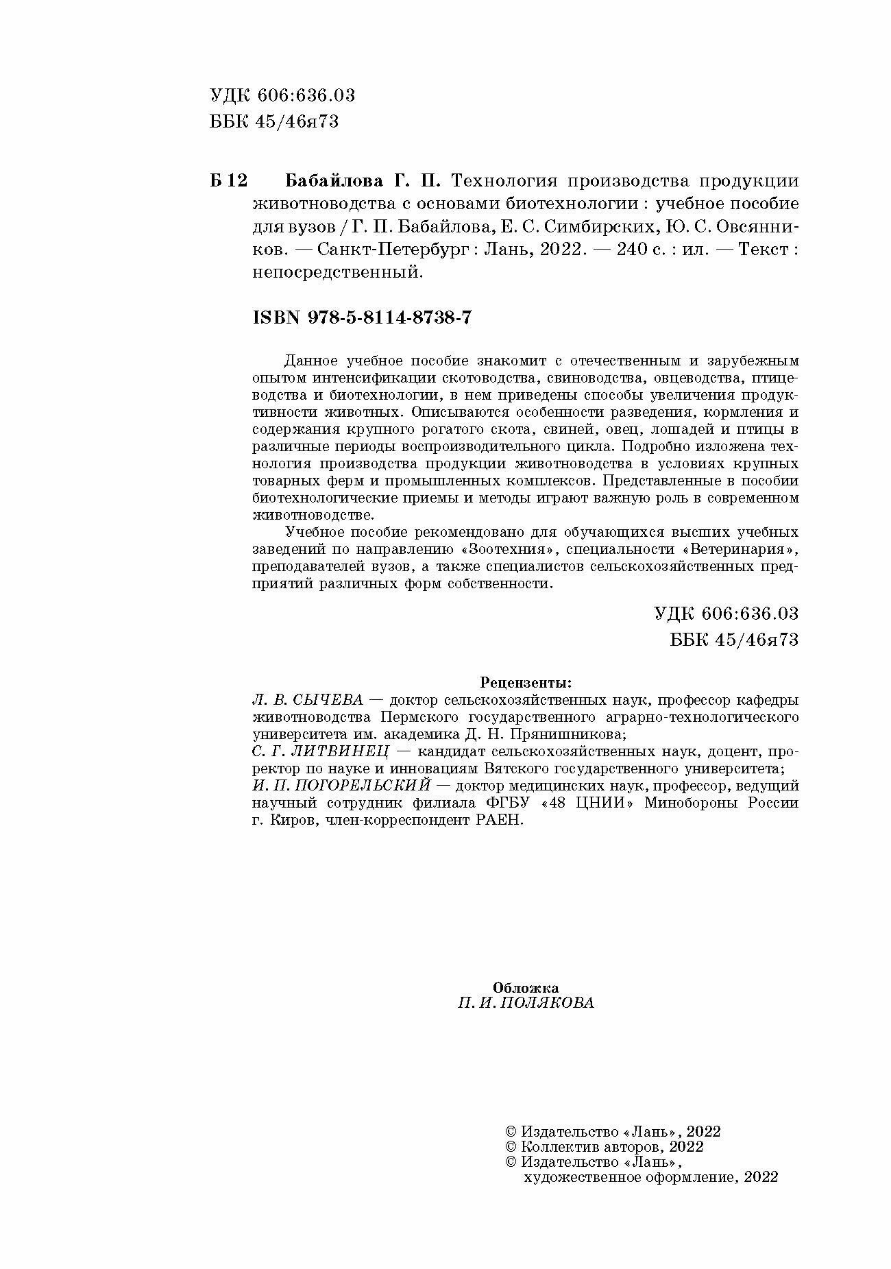 Технология производства продукции животноводства с основами биотехнологии Учебное пособие (Бабайлова Галина Павловна, Симбирских Елена Сергеевна, Овсянников Юрий Степанович); Лань, 2022