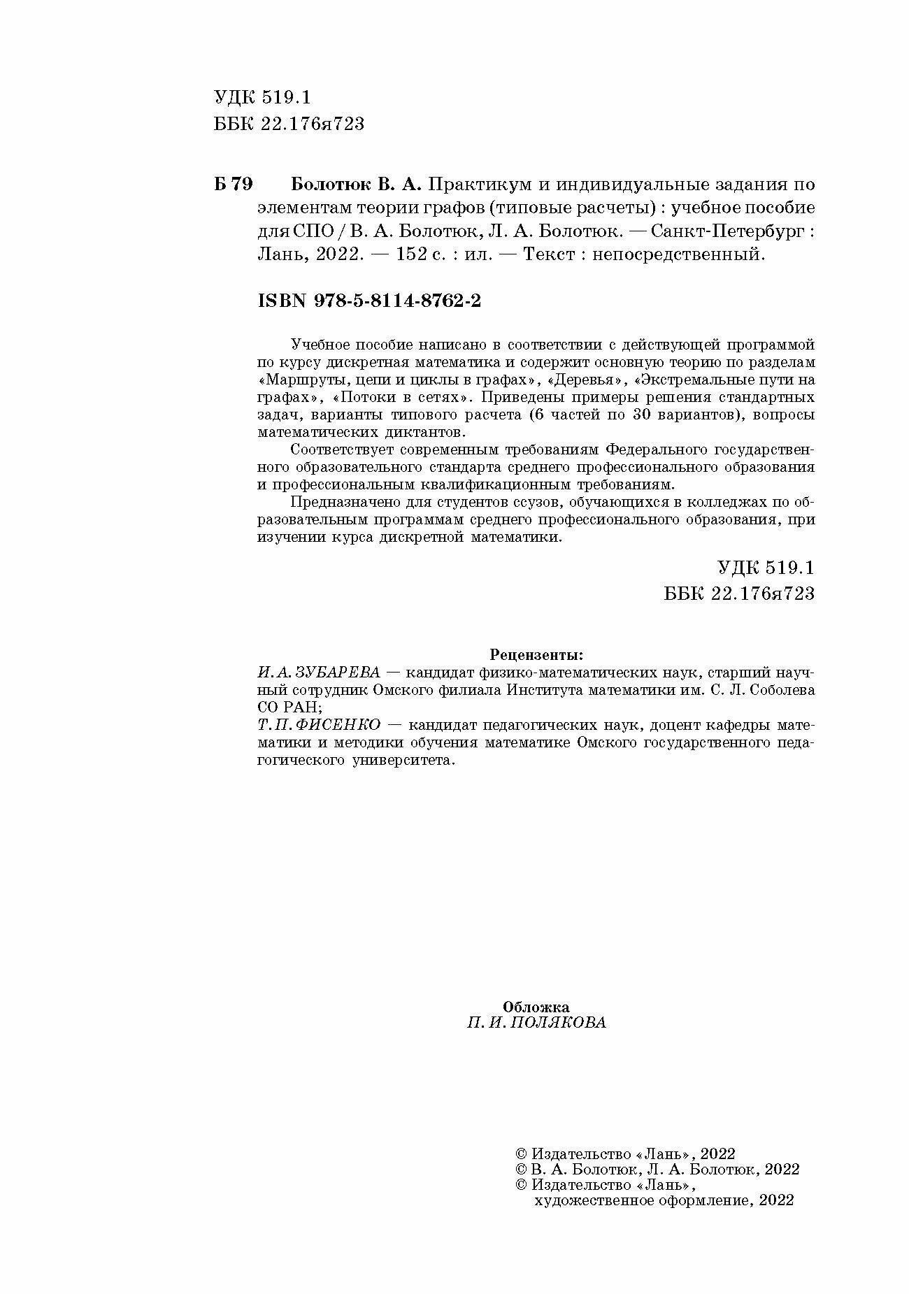Практикум и индивидуальные задания по элементам теории графов типовые расчеты Учебное пособие для СПО (Болотюк Владимир Анатольевич, Болотюк Людмила Анатольевна); Лань, 2022