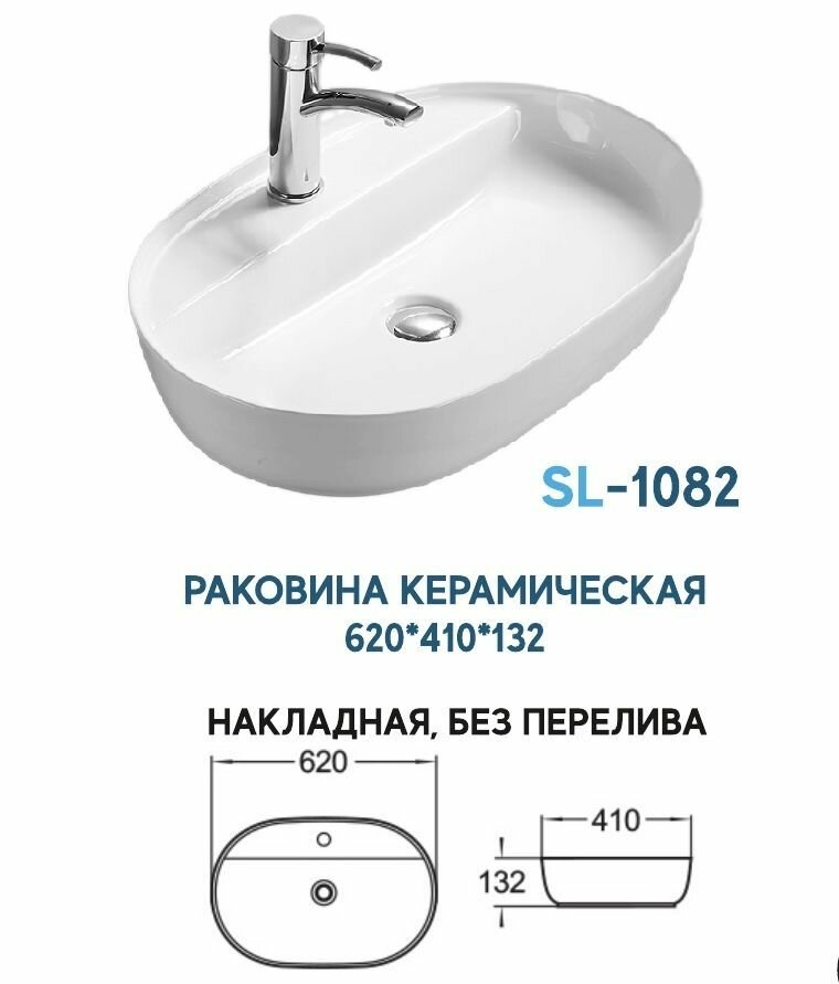 Раковина SantiLine 62х41 SL-1082 керамическая (накладная). Устанавливается на столешницу. Материал санфаянс. Цвет белый. Гарантия 5 лет. Стиль современный.