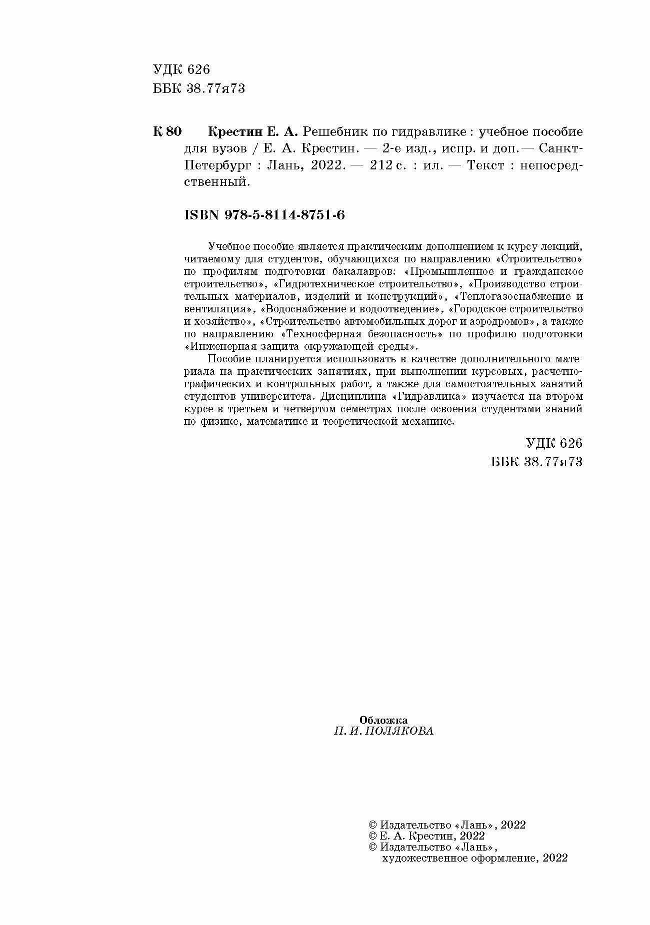 Решебник по гидравлике. Учебное пособие (Е. А. Крестин); Издательство ЛАНЬ, 2022