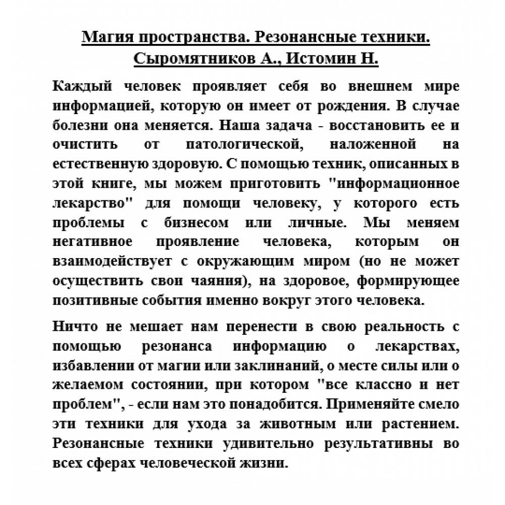 Каждый человек проявляет себя во внешнем мире информацией, которую он имеет от рождения. В случае болезни она меняется. Наша задача - восстановить ее и очистить от патологической, наложенной на естественную здоровую. С помощью техник, описанных в этой книге, мы можем приготовить "информационное лекарство" для помощи человеку, у которого есть проблемы с бизнесом или личные. Мы меняем негативное проявление человека, которым он взаимодействует с окружающим миром (но не может осуществить свои чаяния), на здоровое, формирующее позитивные события именно вокруг этого человека.
