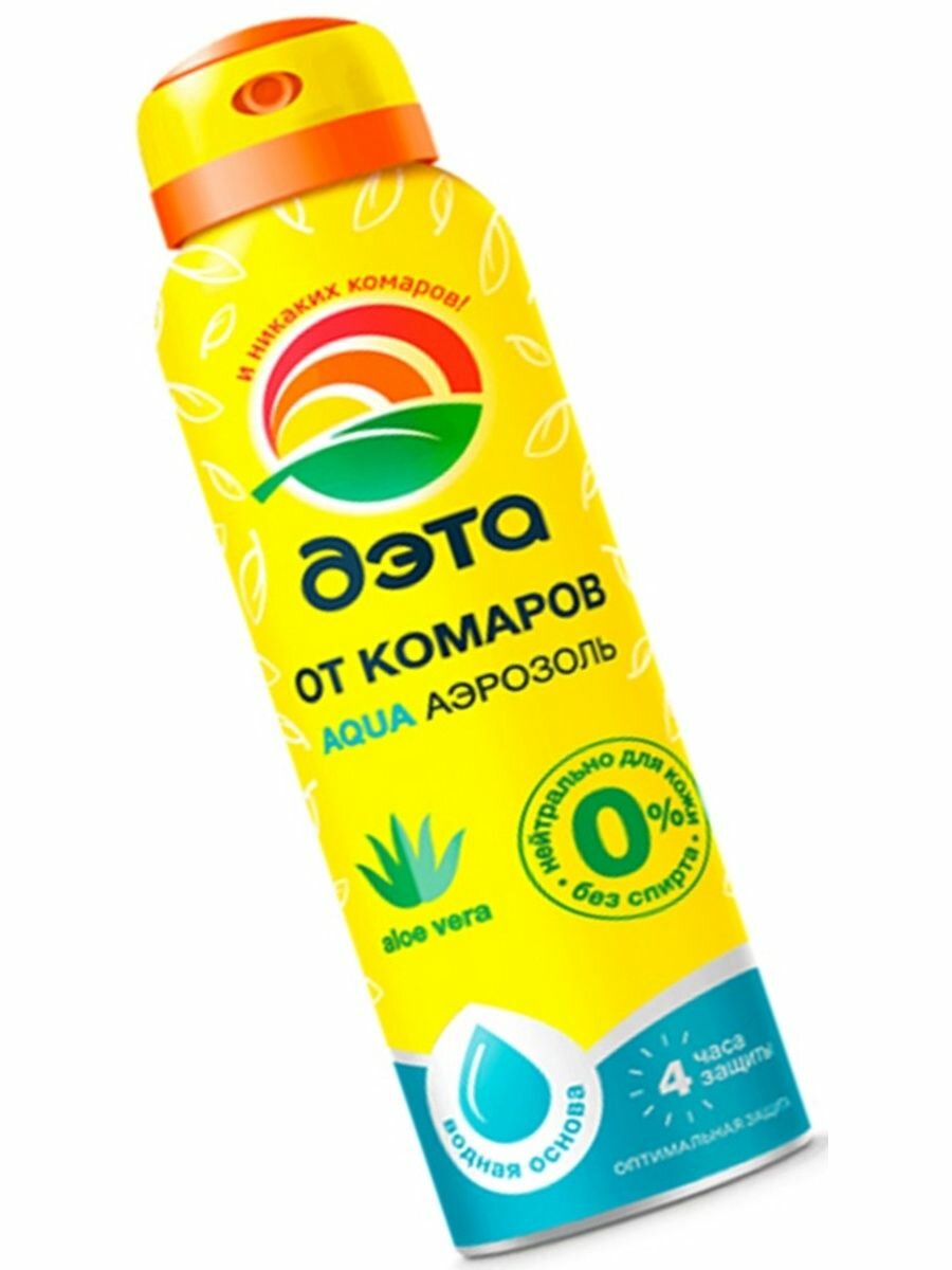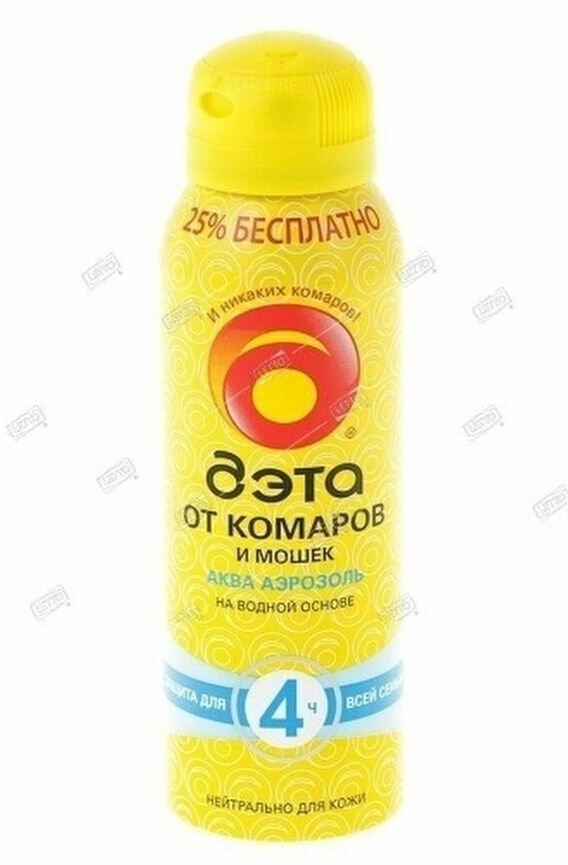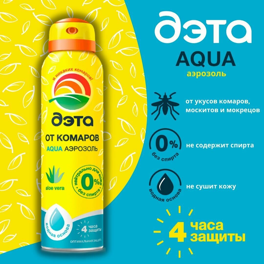 **Аэрозоль для защиты от комаров Дэта Аква** подойдет для обработки кожи и тканей. Отличается гипоаллергенностью и приятным ароматом цитрусовых. Не содержит спирта, не сушит кожные покровы. Не оставляет после высыхания липких и жирных пятен.