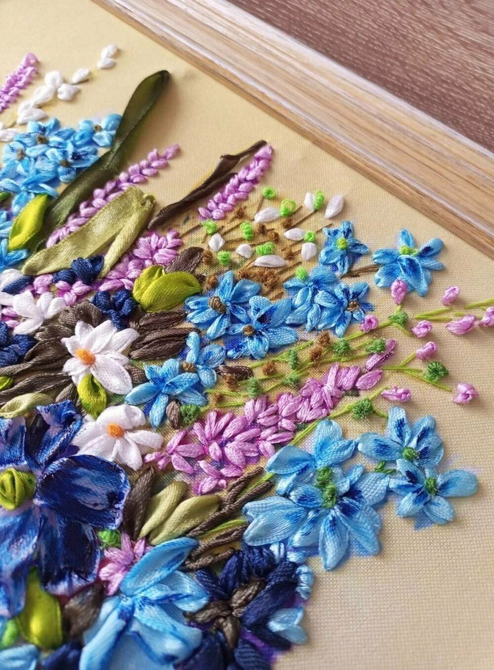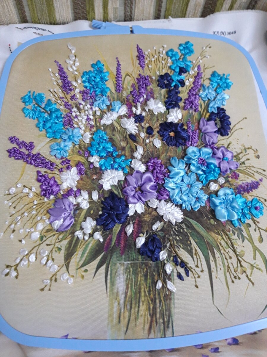 Представляем набор для вышивки лентами «Живокость полевая». Размер вышитой работы – 25х36 см. На картине изображены нежные цветы в вазе. Этот натюрморт способен украсить ваш интерьер, стать оригинальным украшением дома или дачи. Вышивка лентой используется для создания картин и объёмных панно, а также для декорирования одежды, пледов, подушек, пододеяльников, наволочек.Вышивание лентами – это вид рукоделия с использованием иглы с большим ушком и ленточками, для которого характерно нанесение рисунка на ткань. Такая вышивка позволяет создавать невероятно красивые и неповторимо оригинальные картины. И именно цветочные композиции становятся излюбленным сюжетом рукодельниц. Их предпочитают за поразительную схожесть с настоящими букетами.В состав набора для вышивки лентой входит:· ткань (габардин) с нанесённым рисунком;· атласные ленты из 100% полиэстера (9 цветов);· нити мулине из хлопка на органайзере;· специальная игла для вышивания;· цветная символьная схема на бумаге;· 2 инструкции – по вышивке и по стежкам.К набору для вышивки лентами дополнительно могут потребоваться краски (акварель, акрил). Набор с частичной выкладкой подходит и для взрослых, и для детей от 12 лет. Овладев техникой вышивки лентами, можно создавать яркие узоры и цветы, которые внешне трудно отличить от настоящих. Это более сложный вид рукоделия, чем вышивка крестом на канве, поскольку в наборе есть ленты.При вышивке лентами важна аккуратность, так как им свойственна мягкость и податливость. Для работы с атласной тканью требуется особое внимание и точность. Вышивание ленточками с помощью нитей станет вызовом для начинающих рукодельниц. Но благодаря практике и терпению можно достичь высокого уровня мастерства в этом виде рукоделия.