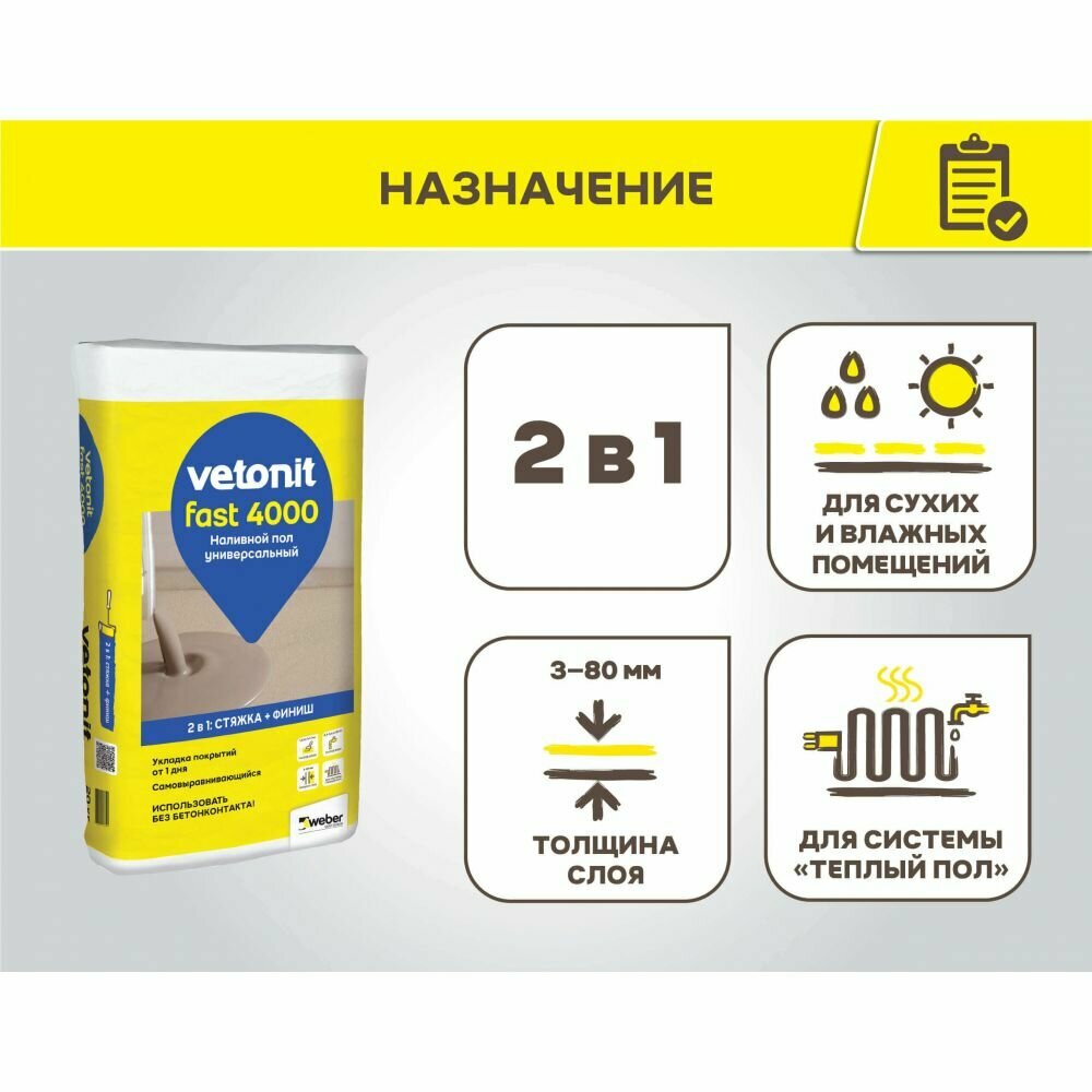 Универсальный наливной пол "2 в 1: стяжка + финиш". Для выравнивания оснований (слоем 5-80 мм) под укладку различных наполных покрытий. Для системы "Теплый пол". Ручное и механизированное нанесение. Для внутренних работ в сухих и влажных помещениях.