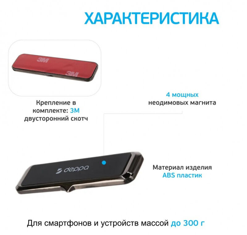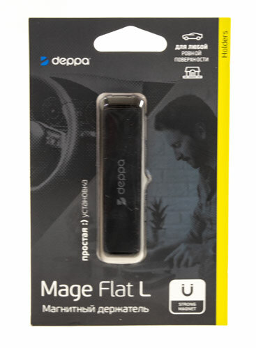 Универсальный автомобильный держатель Deppa Mage Flat L позволяет фиксировать смартфон на любой вертикальной или наклонной поверхности. Подходит для всех цифровых устройств массой до 300 грамм. Для автомобиля и дома Deppa Mage Flat L — автомобильный держатель, который при желании можно использовать дома или в офисе. Небольшой магнитный аксессуар способен удерживать на весу любое цифровое устройство, которое весит не более трехсот грамм. Он удобен для фиксации смартфона на панели перед водителем или в другом месте автомобиля. Держатель подходит для iPhone 12, 12 Pro и других моделей. Возможно крепление на наклонной и вертикальной, но обязательно ровной поверхности. Просто и надежно Deppa Mage Flat L — плоский держатель компактных размеров. Он удачно вписывается в интерьер автомобильного салона, практически незаметен. В составе держателя — четыре неодимовых магнита, обеспечивающих фиксацию цифрового устройства за счет притяжения металлических элементов. При этом отсутствует негативное воздействие на работу гаджета. Держатель легко и быстро устанавливается в нужном месте с помощью двустороннего скотча 3M, который предлагается в комплекте и обеспечивает надежное крепление к поверхности.