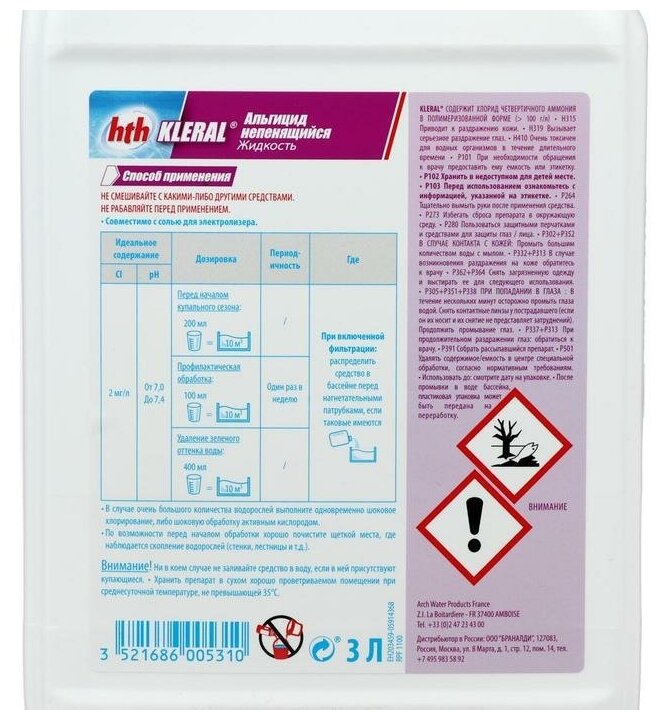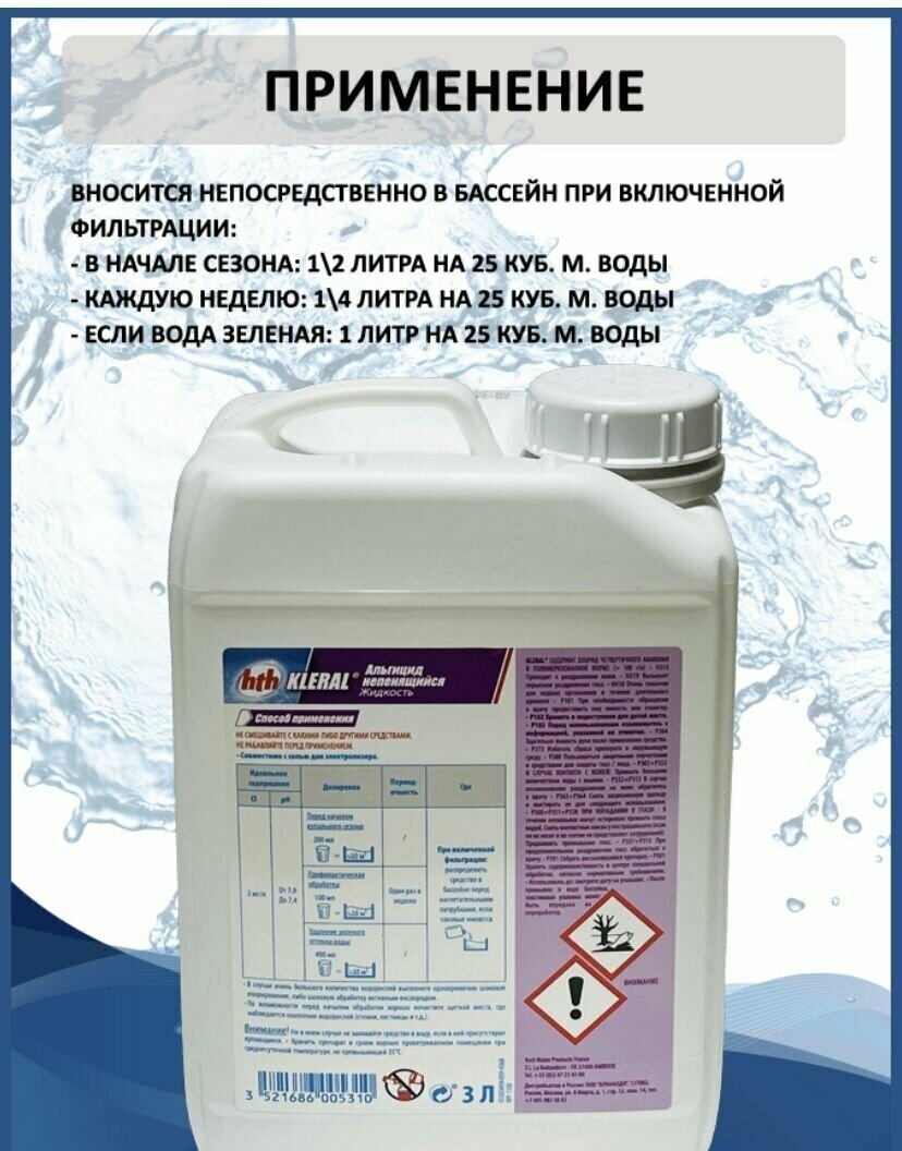 Очистка зеленоватой воды:Внести препарат в воду из расчета 1 литр на 25 куб.м воды. При высокой засоренности водорослями провести одновременно ударную обработку быстро растворяющимся хлорным препаратом, который вы применяете при регулярной обработке (предварительно установить уровень: рН между 7.0 и 7.4).