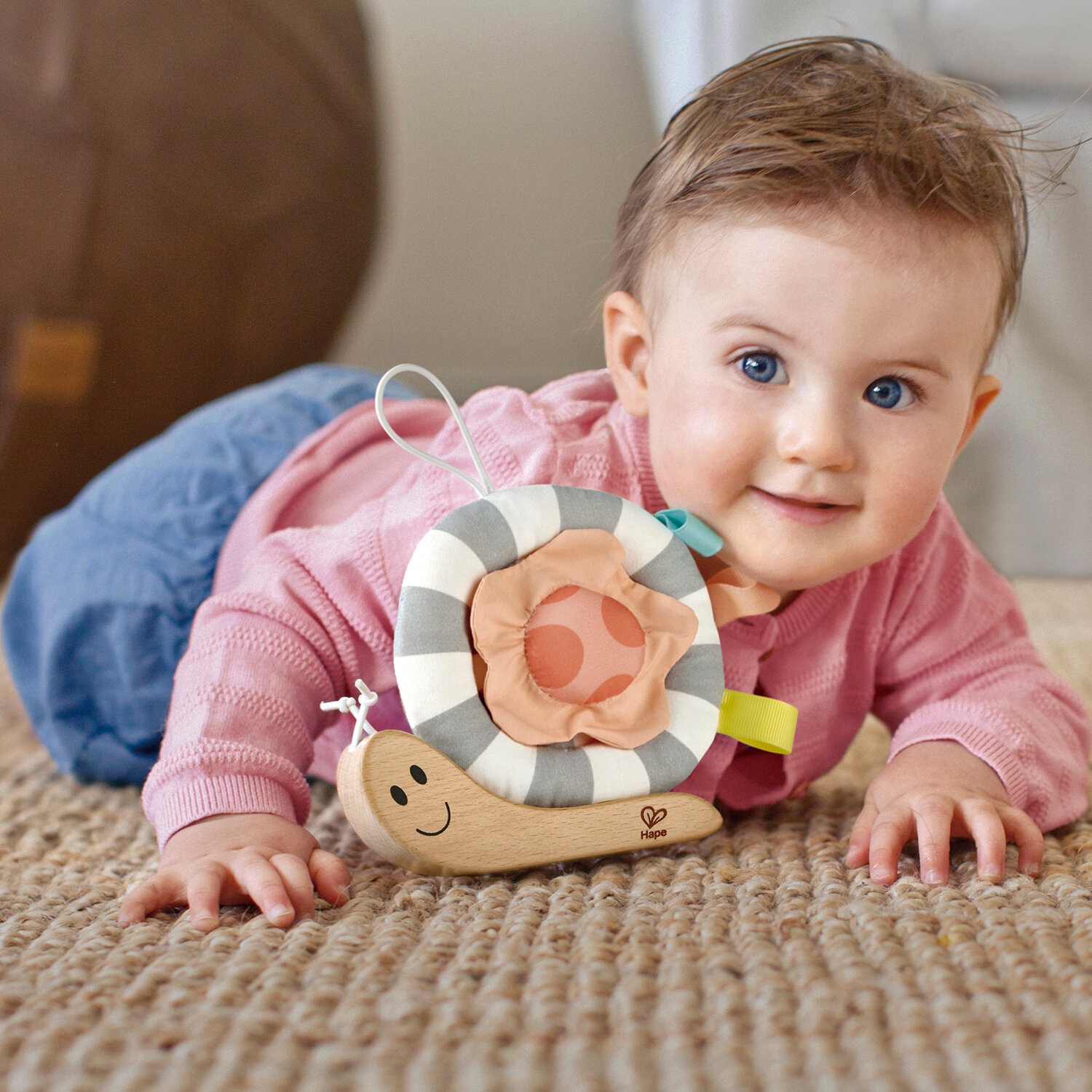 Эта дружелюбная улитка с крючками — отличный способ порадовать ваших малышей, пока они исследуют мир. Легко прикрепляемая к кроватке или коляске, улитка имеет симпатичное улыбающееся лицо, зеркало на одной стороне раковины и гремящий цветок на другой стороне. Отлично подходит для поощрения сенсорного развития, а также любви к животным.