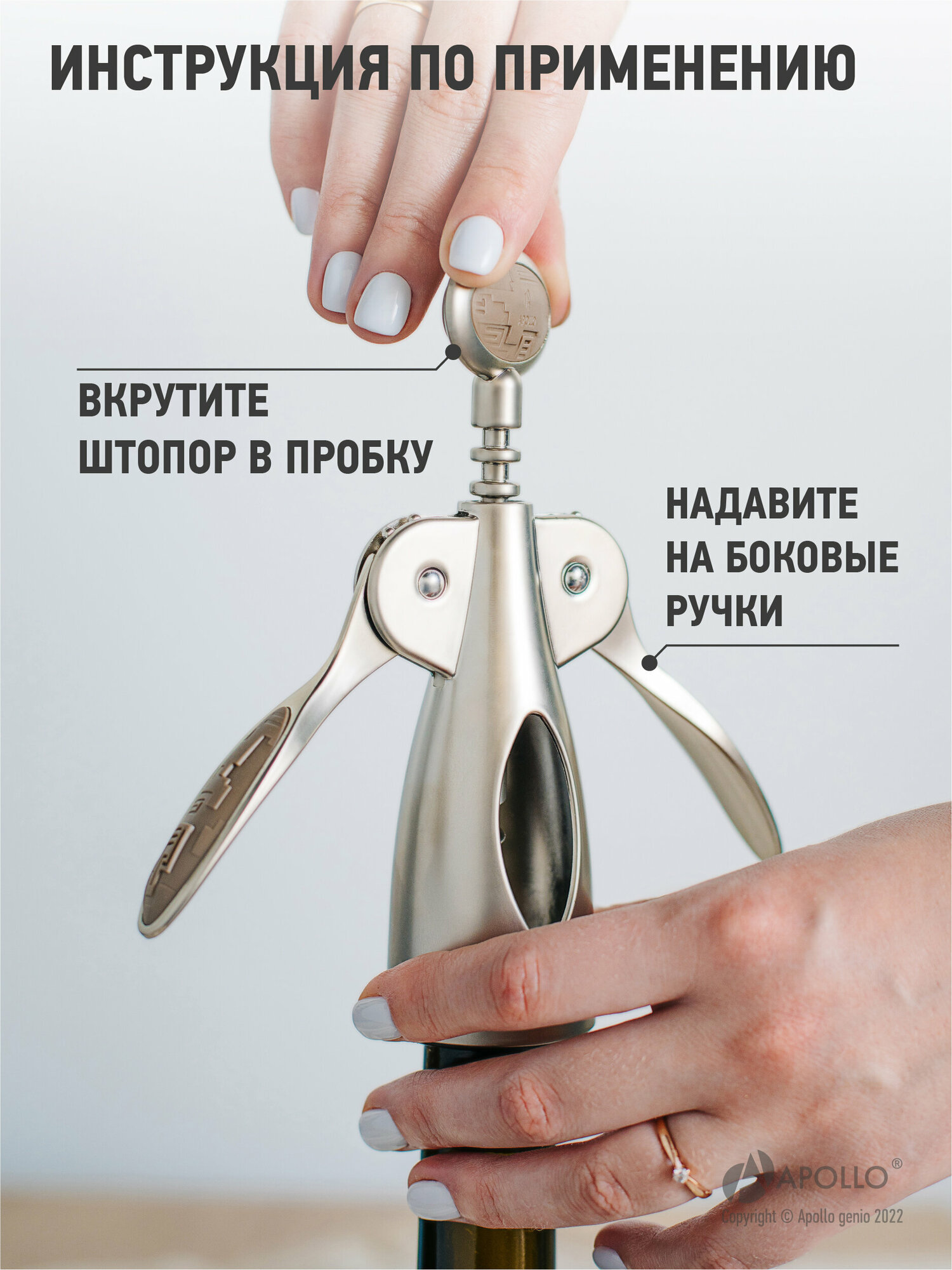 Штопор имеет два рычага с помощью которых вы легко сможете вытащить пробку из бутылки. Материалы изготовления: цинковый сплав, пищевой пластик TPR.